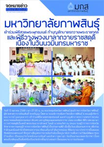 วันที่ 3 กุมภาพันธ์ 2566 ที่จวนผู้ว่าราชการจังหวัดกาฬสินธุ์ โดยรองศาสตราจารย์จิระพันธ์ ห้วยแสน อธิการบดีมหาวิทยาลัยกาฬสินธุ์ นายอรรถพงษ์ ศิริสุวรรณ รองอธิการบดีมหาวิทยาลัยกาฬสินธุ์ นางปฏิมา บุษราคำ ผู้อำนวยการสำนักงานอธิการบดี และบุคลากร มหาวิทยาลัยกาฬสินธุ์ ร่วมบริจาคเงินจำนวน 10,000 บาท และจักรยาน 1 คัน เพื่อร่วม “วันรวมน้ำใจ สู่กาชาด ประจำปี 2566 เนื่องในการจัดงานมหกรรมโปงลาง แพรวาและงานกาชาดจังหวัดกาฬสินธุ์ ประจำปี 2566 ระหว่างวันที่ 17-26 กุมภาพันธ์ 2566 ณ บริเวณสนามหน้าศาลากลางจังหวัดกาฬสินธุ์ (หลังใหม่) โดยมีผู้ช่วยศาสตราจารย์จุรีรัตน์ กอเจริญยศ นายกเหล่ากาชาดจังหวัดกาฬสินธุ์ เป็นประธานรับมอบ ณ จวนผู้ว่าราชการจังหวัดกาฬสินธุ์ อำเภอเมืองกาฬสินธุ์ จังหวัดกาฬสินธุ์