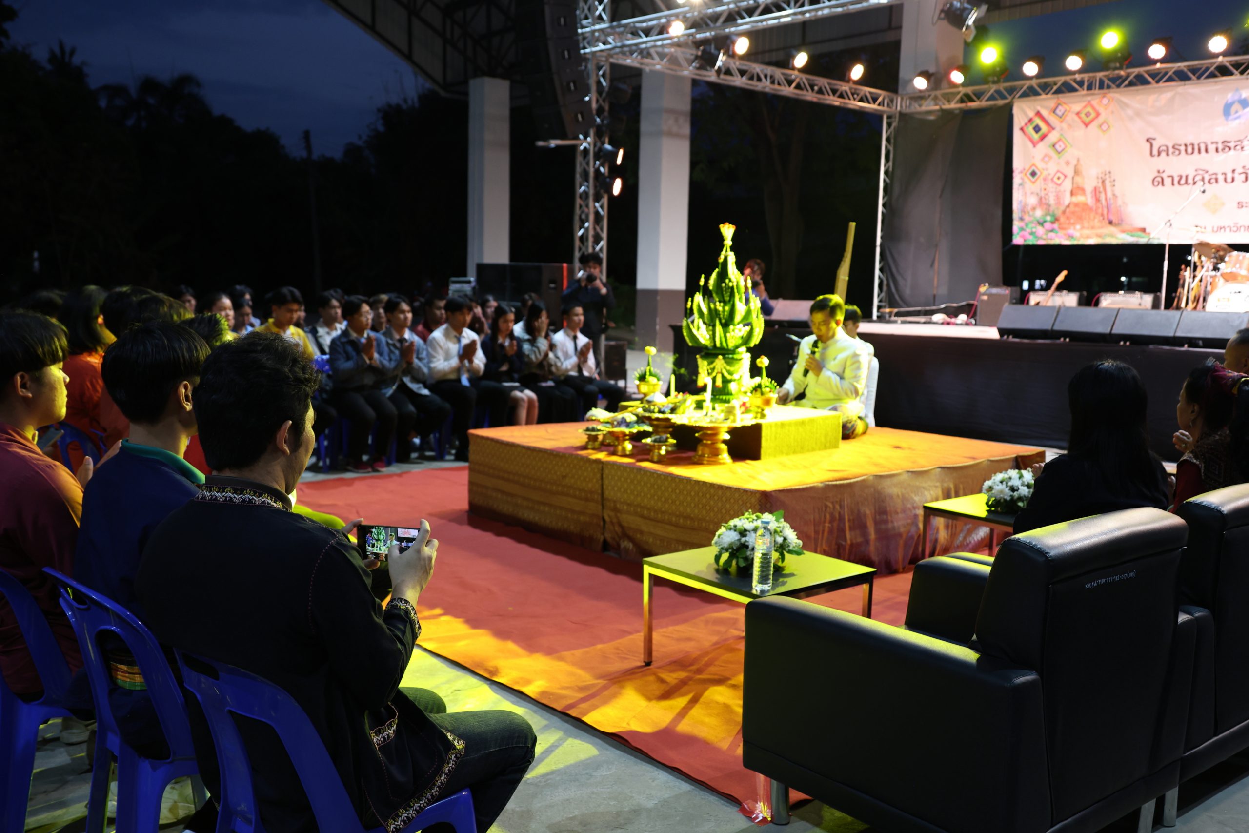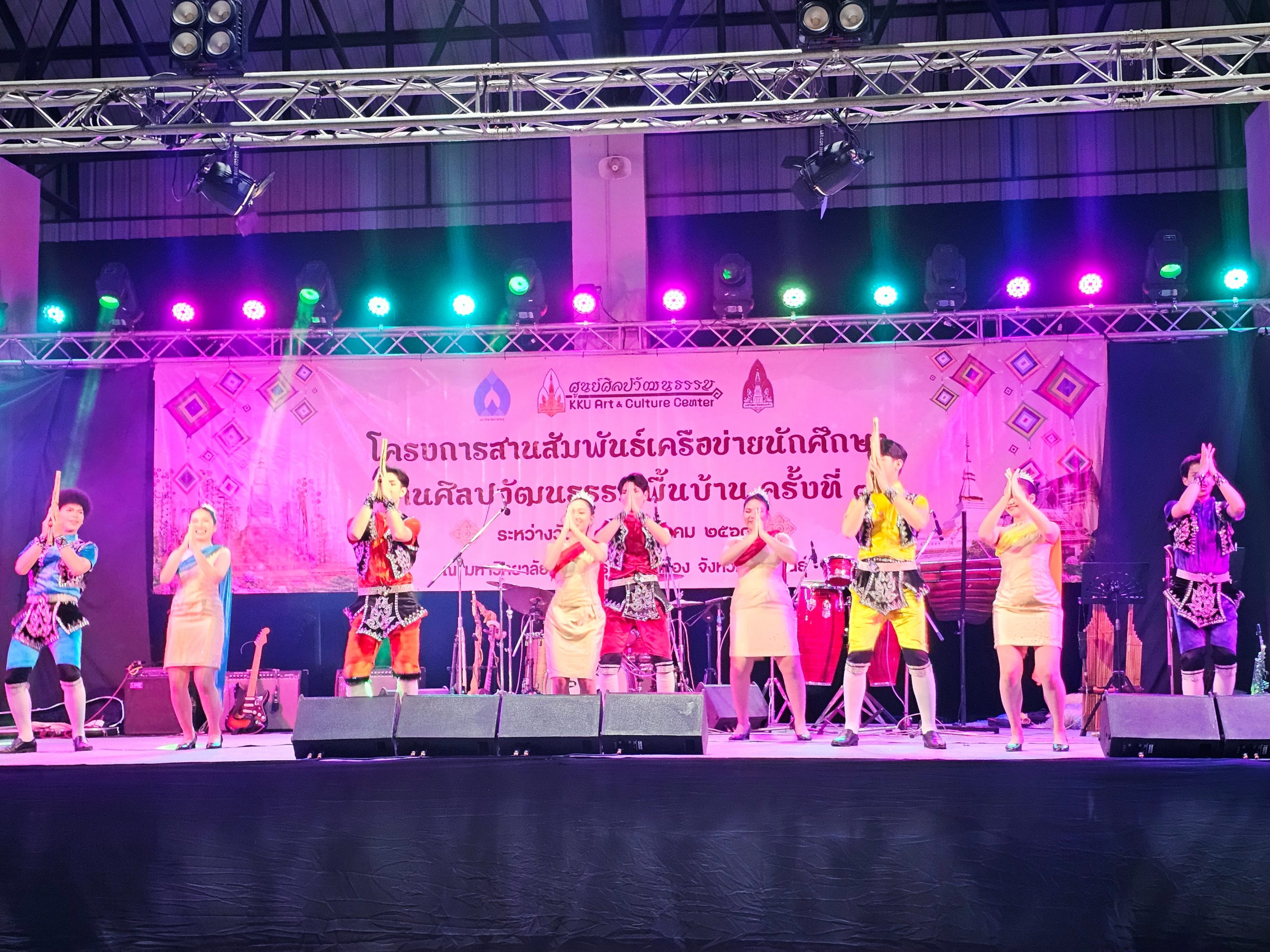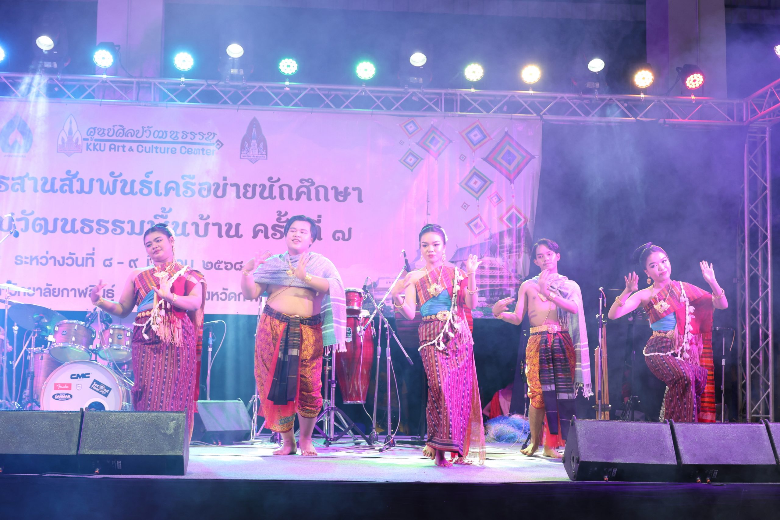 การจัดกิจกรรมสานสัมพันธ์เครือข่ายนักศึกษาด้านศิลปวัฒนธรรมพื้นบ้าน ครั้งที่ 7 ประจำปี 2568 ในครั้งนี้ กิจกรรมช่วงเย็น กิจกรรม“สืบสานศิลป์ สานสัมพันธ์ เครือข่ายวัฒนธรรมแห่งมิตรภาพ แก่น-สินธุ์” วัตถุประสงค์เพื่อการจัดงานกิจกรรมการสร้างเครือข่ายความร่วมมือด้านทำนุบำรุงศิลปวัฒนธรรมเป็นหนึ่งในยุทธศาสตร์มหาวิทยาลัยขอนแก่น เพื่อให้นักศึกษาได้เรียนรู้วัฒนธรรม ขนบธรรมเนียม และประเพณีท้องถิ่นร่วมกันอนุรักษ์ ส่งเสริม และพัฒนาต่อยอดภูมิปัญญาพื้นบ้านอีสานและเป็นเวทีให้นักศึกษาได้แลกเปลี่ยนเรียนรู้การจัดกิจกรรมด้านศิลปวัฒนธรรมของนักศึกษา ตลอดจนส่งเสริมให้นักศึกษาภาคภูมิใจในการรักษาขนบธรรมเนียมประเพณีอันดีงามต่อไป