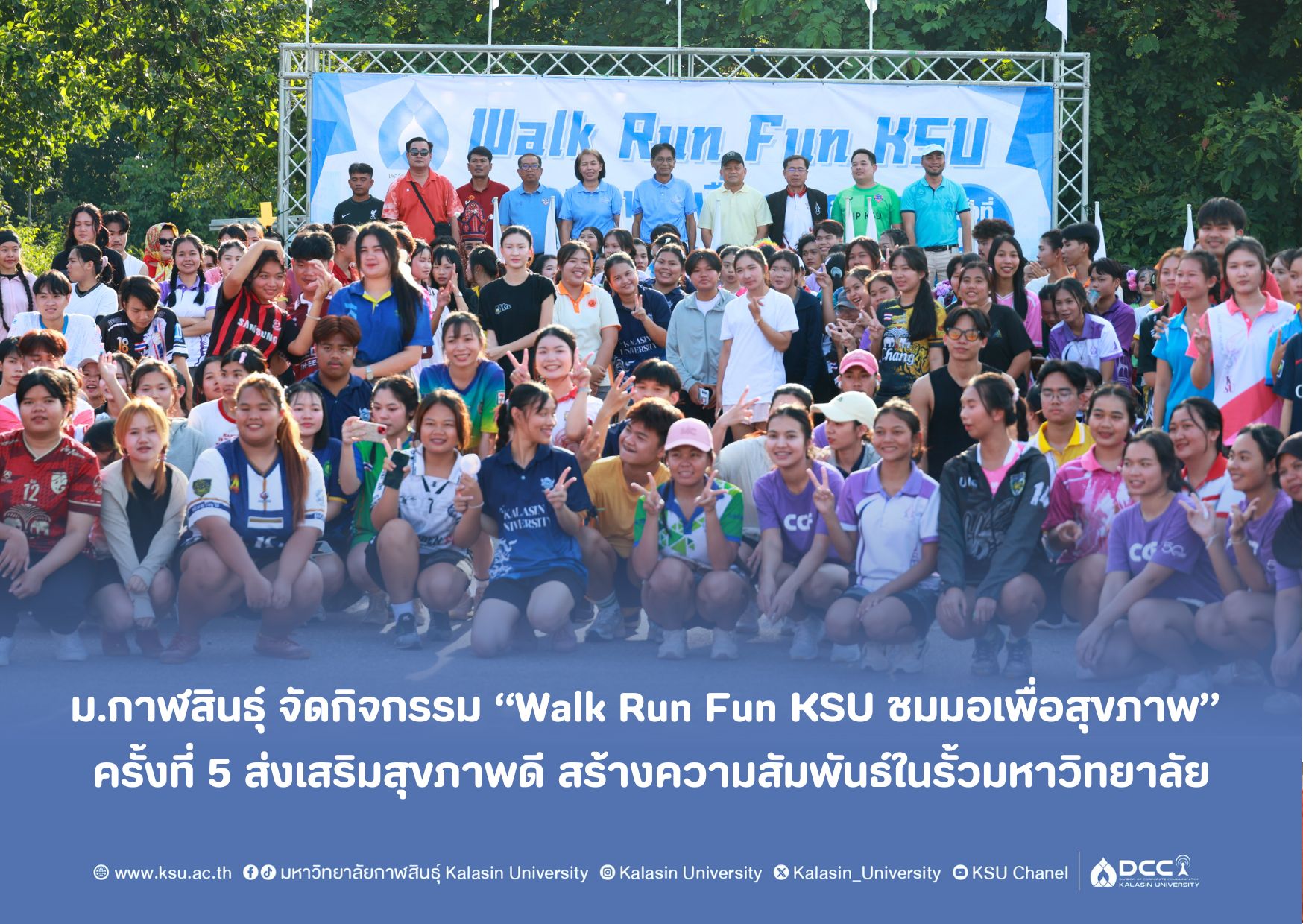 กิจกรรม “Walk Run Fun KSU ชมมอเพื่อสุขภาพ” จัดขึ้นเป็นประจำทุกปี และในครั้งนี้ถือเป็นปีที่ 5 ซึ่งยังคงได้รับการตอบรับอย่างอบอุ่นจากชาว ม.กาฬสินธุ์ทุกภาคส่วน
