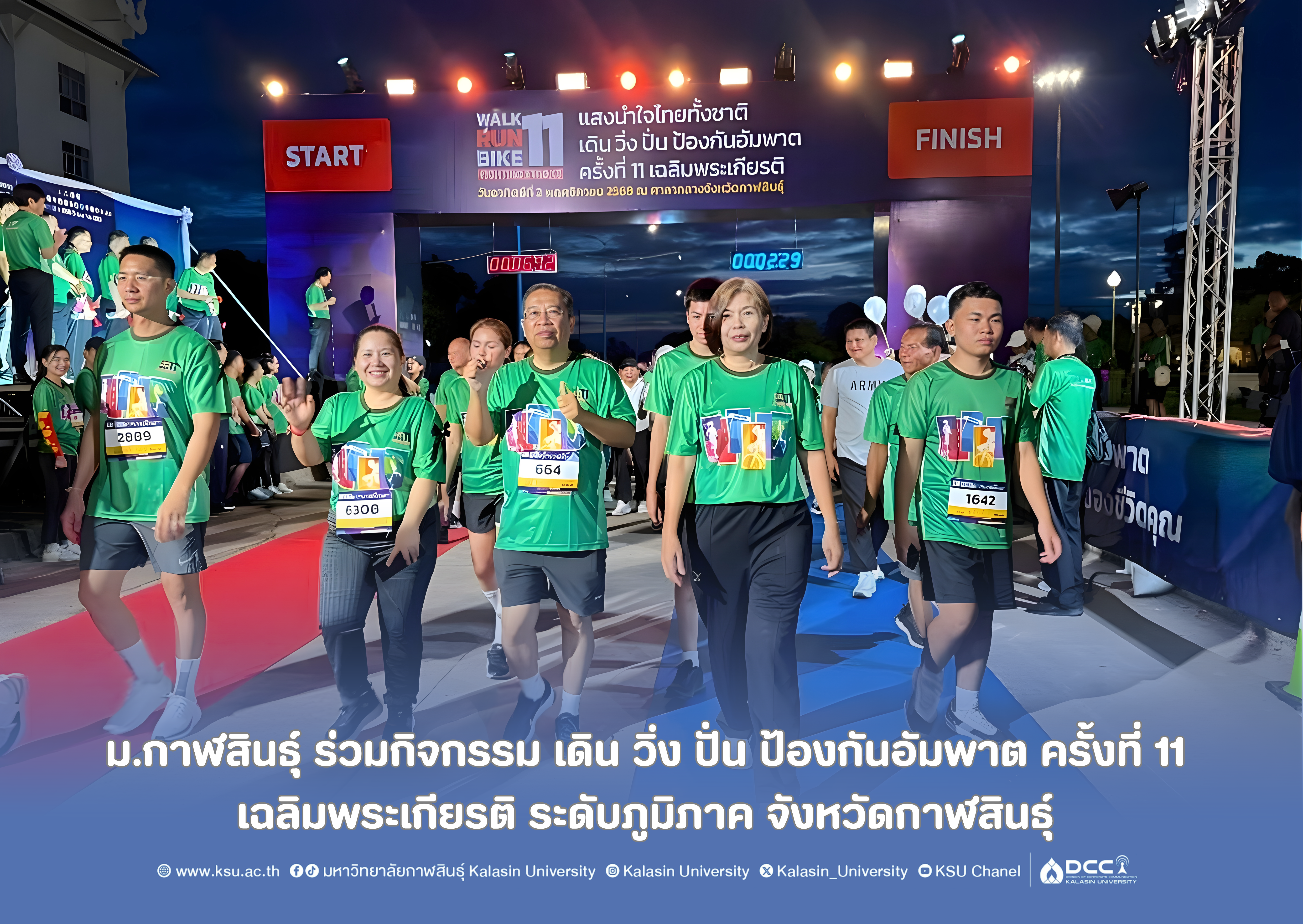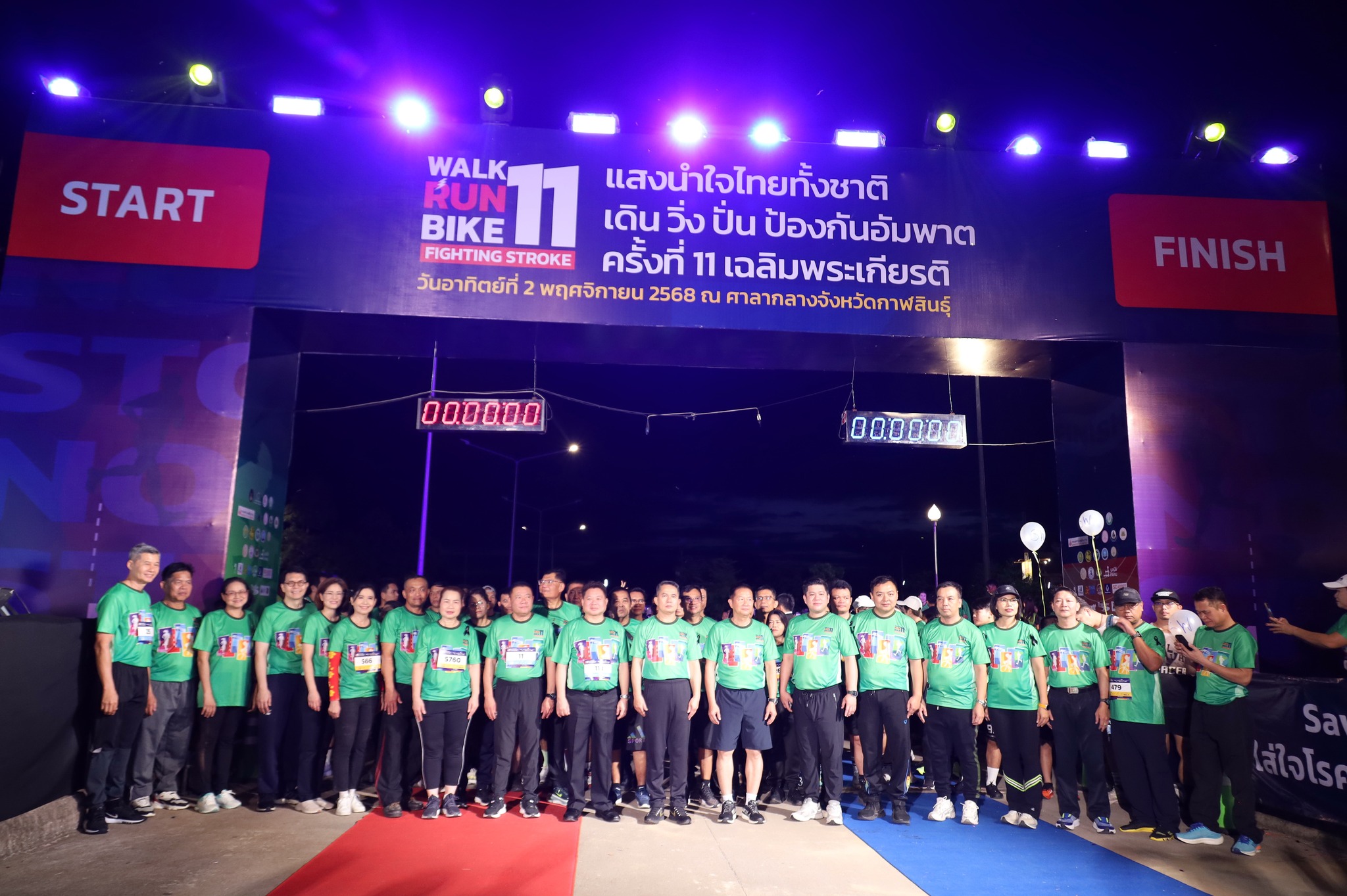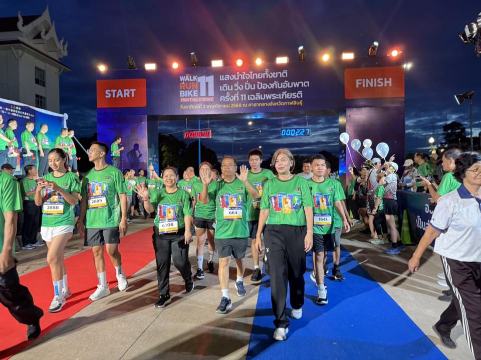 เมื่อวันที่ 2 พฤศจิกายน 2568 เวลา 04.30 น. ณ ศาลากลางจังหวัดกาฬสินธุ์ ศูนย์ราชการจังหวัดกาฬสินธุ์ ผู้ช่วยศาตราจารย์ ดร.คมสันทิ์ ขจรปัญญาไพศาล รองอธิการบดีมหาวิทยลัยกาฬสินธุ์ นำคณะผู้บริหาร และบุคลากร เข้าร่วมกิจกรรม เดิน วิ่ง ปั่น ป้องกันอัมพาต ครั้งที่ 11 เฉลิมพระเกียรติ ระดับภูมิภาค จังหวัดกาฬสินธุ์ นายสุวรรธณ์ เข็มธนเพ็ชร รองผู้ว่าราชการจังหวัด รักษาราชการแทนผู้ว่าราชการจังหวัดกาฬสินธุ์ เป็นประธานในพิธีกล่าวแสดงความอาลัย และน้อมรำลึกในพระมหากรุณาธิคุณ และยืนสงบนิ่งแสดงความอาลัยสมเด็จพระนางเจ้าสิริกิติ์ พระบรมราชินีนาถ พระบรมราชชนนีพันปีหลวง และเป็นประธานเปิดกิจกรรม เดิน วิ่ง ปั่น ป้องกันอัมพาต ครั้งที่ 11 เฉลิมพระเกียรติ ระดับภูมิภาค จังหวัดกาฬสินธุ์ โดยมี นายธนภัทร ณ ระนอง นายผดุงศักดิ์ อิ่มเอิบ รองผู้ว่าราชการจังหวัดกาฬสินธุ์ นายสันติ จัตุพันธ์ ปลัดจังหวัดกาฬสินธุ์ หัวหน้าส่วนราชการ ข้าราชการ และประชาชนชาวจังหวัดกาฬสินธุ์ ทุกเพศ ทุกวัย จากทุกอำเภอกว่า 1,500 คนเข้าร่วมกิจกรรม และร่วมชมนิทรรศการเฉลิมพระเกียรติพระบาทสมเด็จพระเจ้าอยู่หัว กิจกรรมให้ความรู้เรื่องโรคหลอดเลือดสมอง และร่วมวิ่งในระยะทาง 5 กิโลเมตร และระยะทาง 10.5 กิโลเมตร
