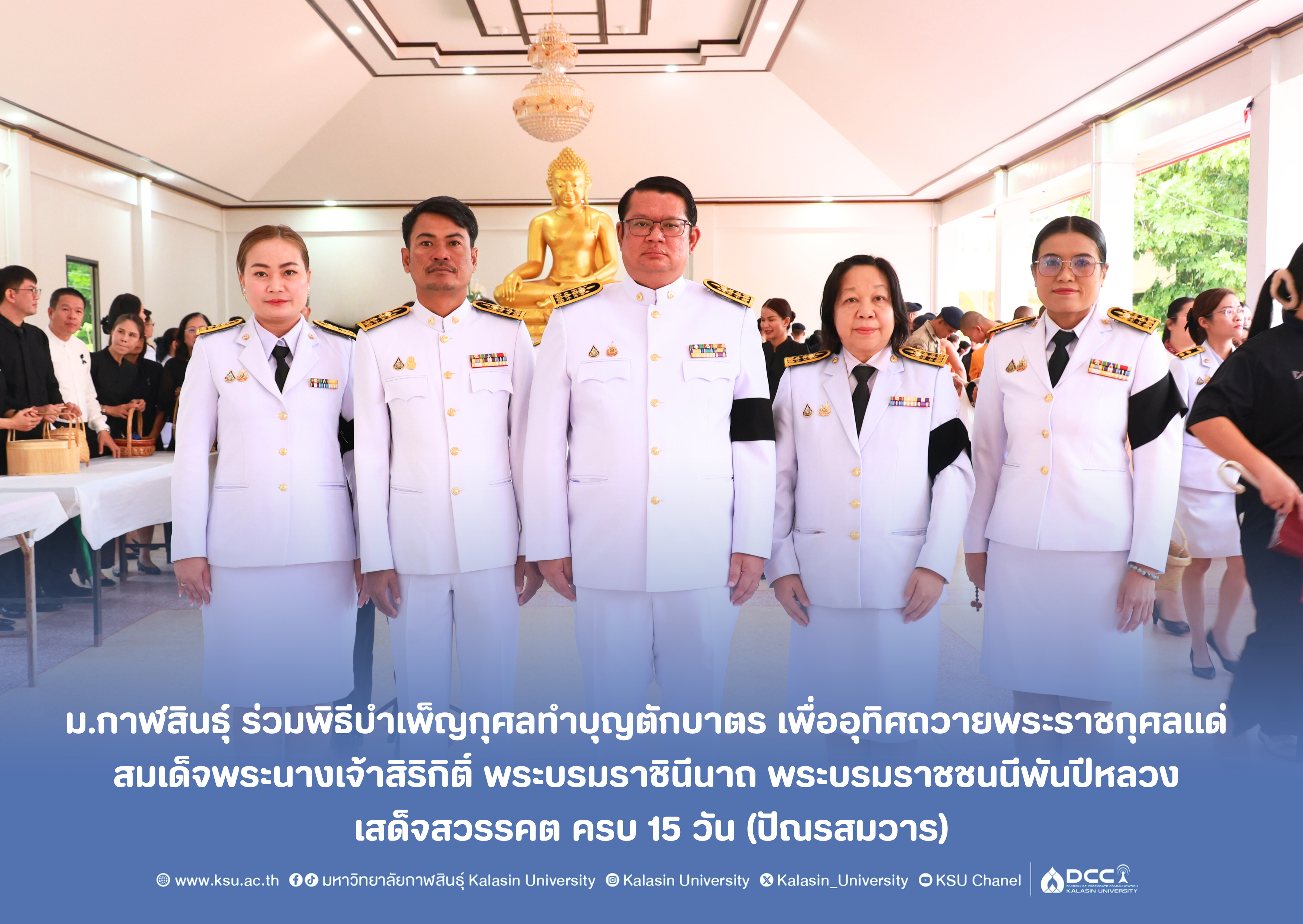 วันนี้(7 พ.ย. 2568) เวลา 07.30 น. ณ วิหารคด เจดีย์ศรีมิ่งเมืองกาฬสินธุ์ วัดประชานิยม พระอารามหลวง อำเภอเมืองกาฬสินธุ์ จังหวัดกาฬสินธุ์ ดร.ลิขิต ศิริสันติเมธาคม รองอธิการบดีมหวิทยาลัยกาฬสินธุ์ นำคณะผู้บริหาร และคณาจารย์ มหาวิทยาลัยกาฬสินธุ์ เข้าร่วมพิธีบำเพ็ญกุศลทำบุญตักบาตร เพื่ออุทิศถวายพระราชกุศลแด่ สมเด็จพระนางเจ้าสิริกิติ์ พระบรมราชินีนาถ พระบรมราชชนนีพันปีหลวง เสด็จสวรรคต ครบ 15 วัน (ปัณรสมวาร) โดยมี นายสุวรรธณ์ เข็มธนเพ็ชร รองผู้ว่าราชการจังหวัดกาฬสินธุ์ รักษาราชการแทนผู้ว่าราชการจังหวัดกาฬสินธุ์ เป็นประธานในพิธีฯ พร้อมทั้งมี นายธนภัทร ณ ระนอง นายผดุงศักดิ์ อิ่มเอิบ รองผู้ว่าราชการจังหวัดกาฬสินธุ์ หัวหน้าส่วนราชการ ข้าราชการตุลาการ ทหาร ตำรวจ ข้าราชการพลเรือน และประชาชนชาวจังหวัดกาฬสินธุ์เข้าร่วมพิธีและร่วมทำบุญตักบาตรพระสงฆ์ สามเณร จำนวน 93 รูป เพื่ออุทิศถวายพระราชกุศลแด่สมเด็จพระนางเจ้าสิริกิติ์ พระบรมราชินีนาถ พระบรมราชชนนีพันปีหลวง