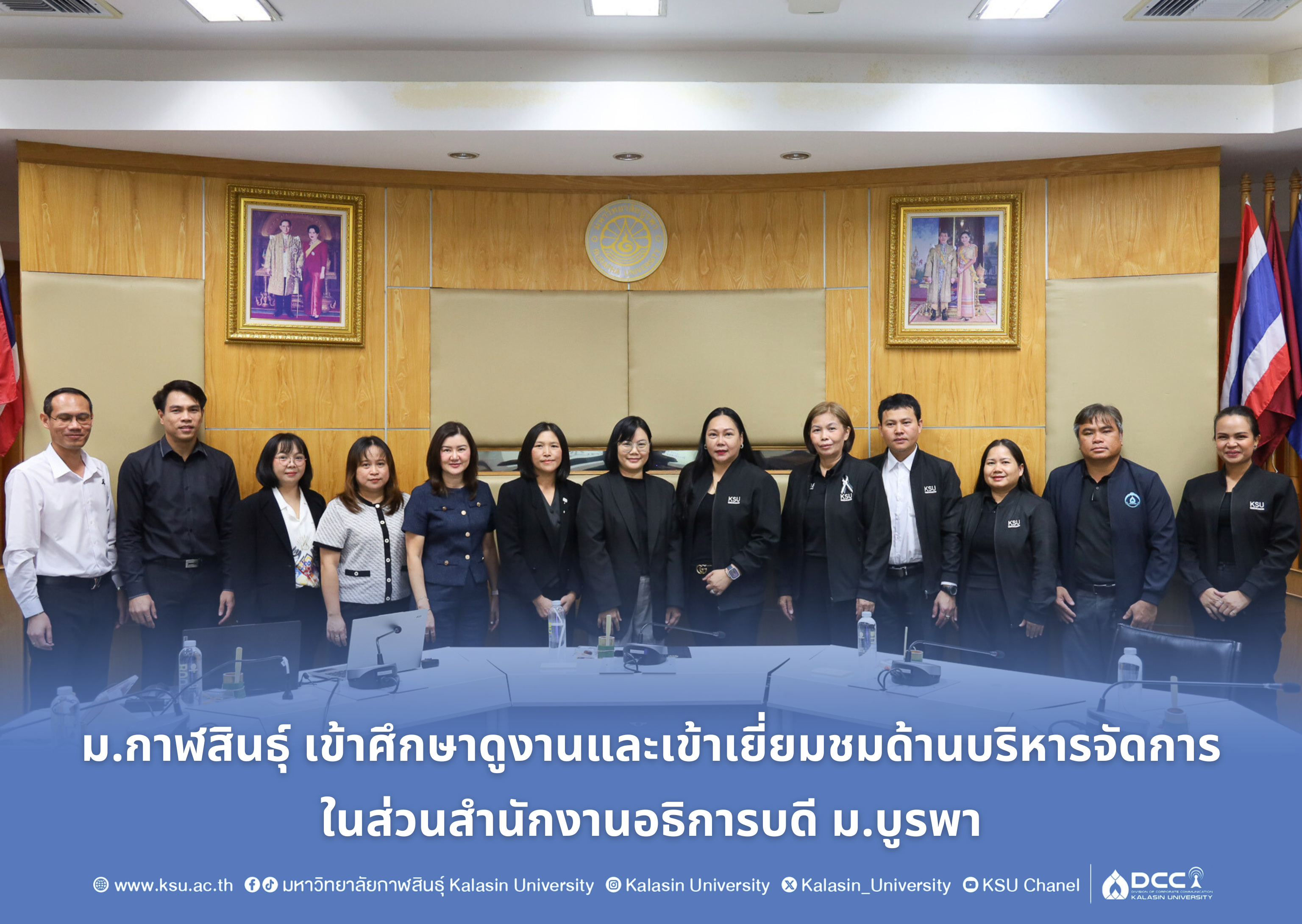 วันนี้ (4 พ.ย. 2568) เวลา 09.00 น. ณ ห้องประชุม 903 ชั้น 9 สำนักงานอธิการบดี (อาคาร ภปร) มหาวิทยาลัยบูรพา ผู้ช่วยศาสตราจารย์มนชยา สภานุชาต ผู้ช่วยอธิการบดีมหาวิทยาลัยกาฬสินธุ์ พร้อมกับนางปฏิมา บุษราคัม ปฏิบัติหน้าที่ผู้อำนวยการสำนักงานอธิการบดี นำบุคลากรสำนักงานอธิการบดีเข้าศึกษาดูงานและเข้าเยี่ยมชมด้านบริหารจัดการในส่วนสำนักงานอธิการบดี มหาวิทยาลัยบูรพา การศึกษาดูงานในครั้งนี้ มหาวิทยาลัยบูรพา ได้นำเสนอการดำเนินงานของ กองกลาง, กองกิจการนิสิต, กองคลังและทรัพย์สิน, กองบริหารและพัฒนาทรัพยากรบุคคล, กองแผนงาน, กองอาคารสถานที่ ที่ได้นำระบบเทคโนโลยีสมัยใหม่เข้ามาช่วยดำเนินการให้การบริหารจัดการเป็นที่รู้จักและเป็นที่ยอมรับในแวดวงมหาวิทยาลัยและหน่วยงานทั้งภายในและต่างประเทศ