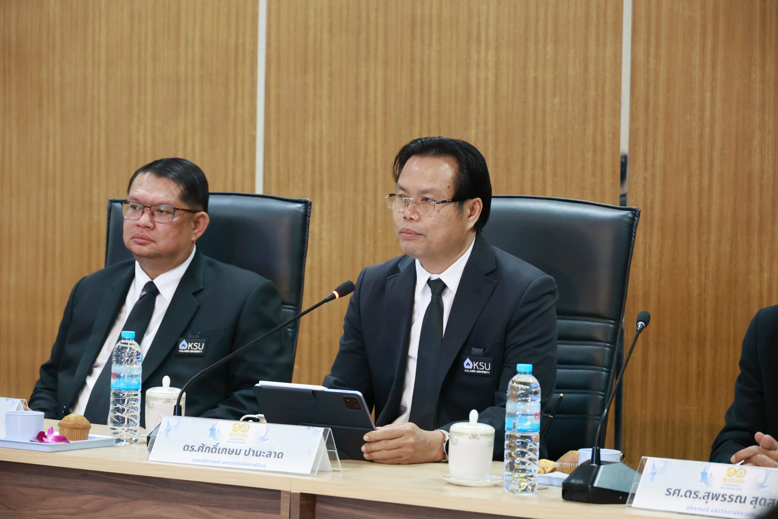 รองศาสตราจารย์ ดร.สุพรรณ สุดสนธิ์ อธิการบดีมหาวิทยาลัยกาฬสินธุ์ ได้เน้นย้ำในระหว่างกล่าวเปิดพิธีว่า การลงนามในครั้งนี้เป็นพันธสัญญาของผู้บริหารทุกระดับในการร่วมกันขับเคลื่อนมหาวิทยาลัยด้วยความมุ่งมั่น โดยมีเป้าหมายหลักคือ “มหาวิทยาลัยเพื่อการพัฒนาท้องถิ่น อย่างยั่งยืนและยกระดับมาตรฐานสู่สากล” การพัฒนาท้องถิ่นอย่างยั่งยืน ผ่านการผลิตบัณฑิต การวิจัย และการบริการวิชาการ ขณะเดียวกันก็ต้องเดินหน้า “ยกระดับมาตรฐานสู่สากล” ในทุกมิติ ทั้งด้านคุณภาพการศึกษา การบริหารจัดการ และผลงานทางวิชาการ เพื่อให้มหาวิทยาลัยกาฬสินธุ์เป็นสถาบันอุดมศึกษาที่มีคุณภาพและสามารถสร้างประโยชน์สูงสุดแก่สังคมได้อย่างแท้จริง การลงนามคำรับรองฯ จึงเป็นจุดเริ่มต้นของการปฏิบัติงานเชิงรุกในปีงบประมาณ 2569