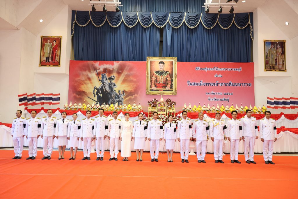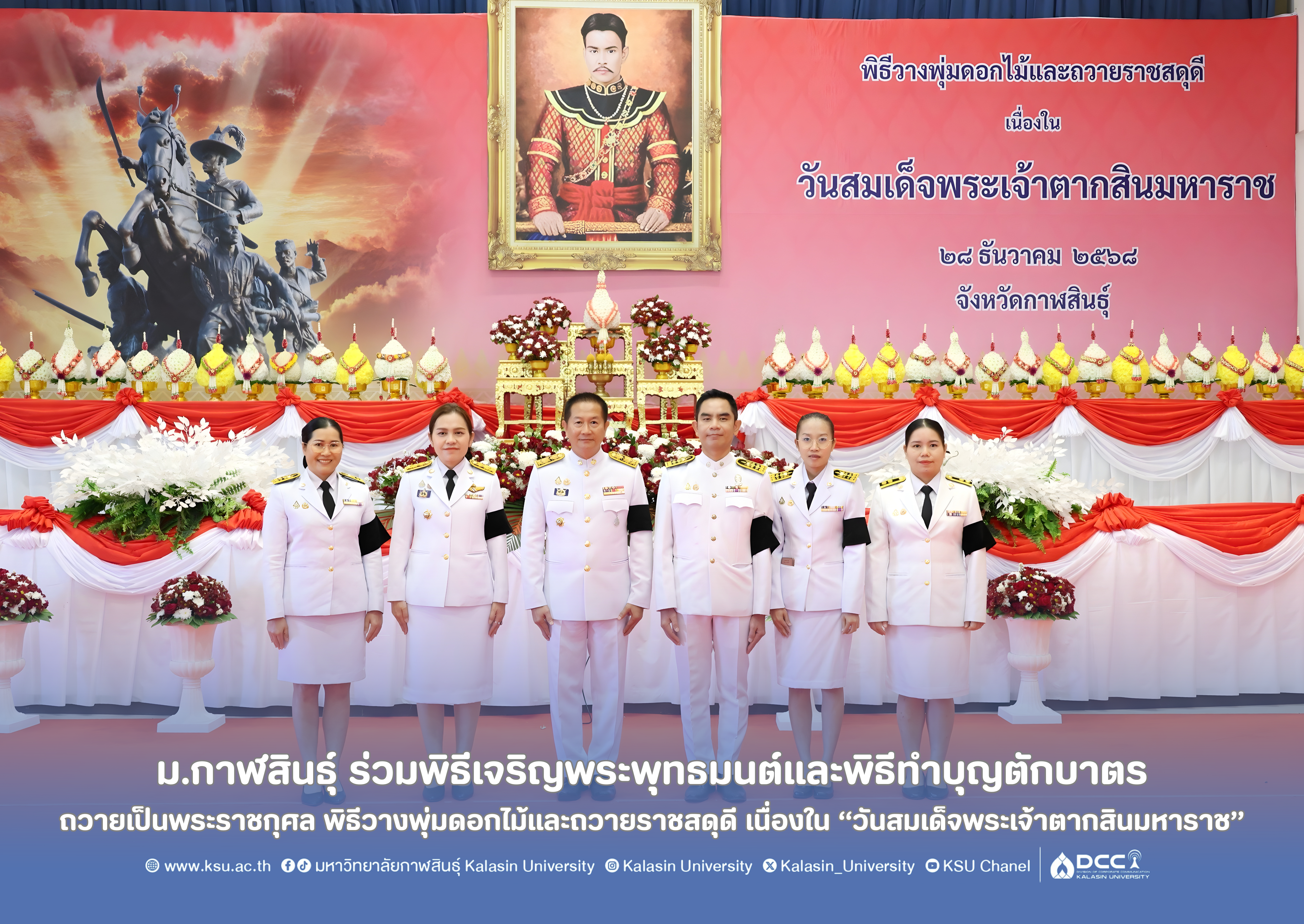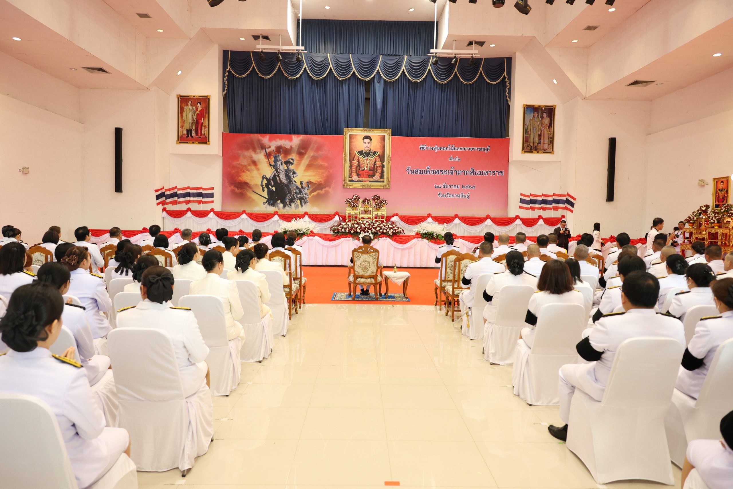 วันนี้ (28 ธันวาคม 2568) เวลา 07.30 น. ณ หอประชุมจังหวัดกาฬสินธุ์ ศูนย์ราชการจังหวัดกาฬสินธุ์ ผู้ช่วยศาสตราจารย์ ดร.อนุชา พิมศักดิ์ ผู้ช่วยอธิการบดีมหาวิทยาลัยกาฬสินธุ์ นำบุคลากรมหาวิทยาลัยกาฬสินธุ์ ร่วมพิธีเจริญพระพุทธมนต์และพิธีทำบุญตักบาตร ถวายเป็นพระราชกุศล พิธีวางพุ่มดอกไม้และถวายราชสดุดี เนื่องใน “วันสมเด็จพระเจ้าตากสินมหาราช” โดยมี นายผดุงศักดิ์  อิ่มเอิบ รองผู้ว่าราชการจังหวัดกาฬสินธุ์ เป็นประธานในพิธี ผู้เข้าร่วมพิธีประกอบด้วย นางฐพัชร์รดา ธนินท์จิรานนท์ รองผู้ว่าราชการจังหวัดกาฬสินธุ์ หัวหน้าส่วนราชการ ข้าราชการพลเรือน ตุลาการ อัยการ ทหาร ตำรวจ คณะกรรมการเหล่ากาชาด  และพสกนิกรชาวจังหวัดกาฬสินธุ์ทุกหมู่เหล่าเข้าร่วมพิธี