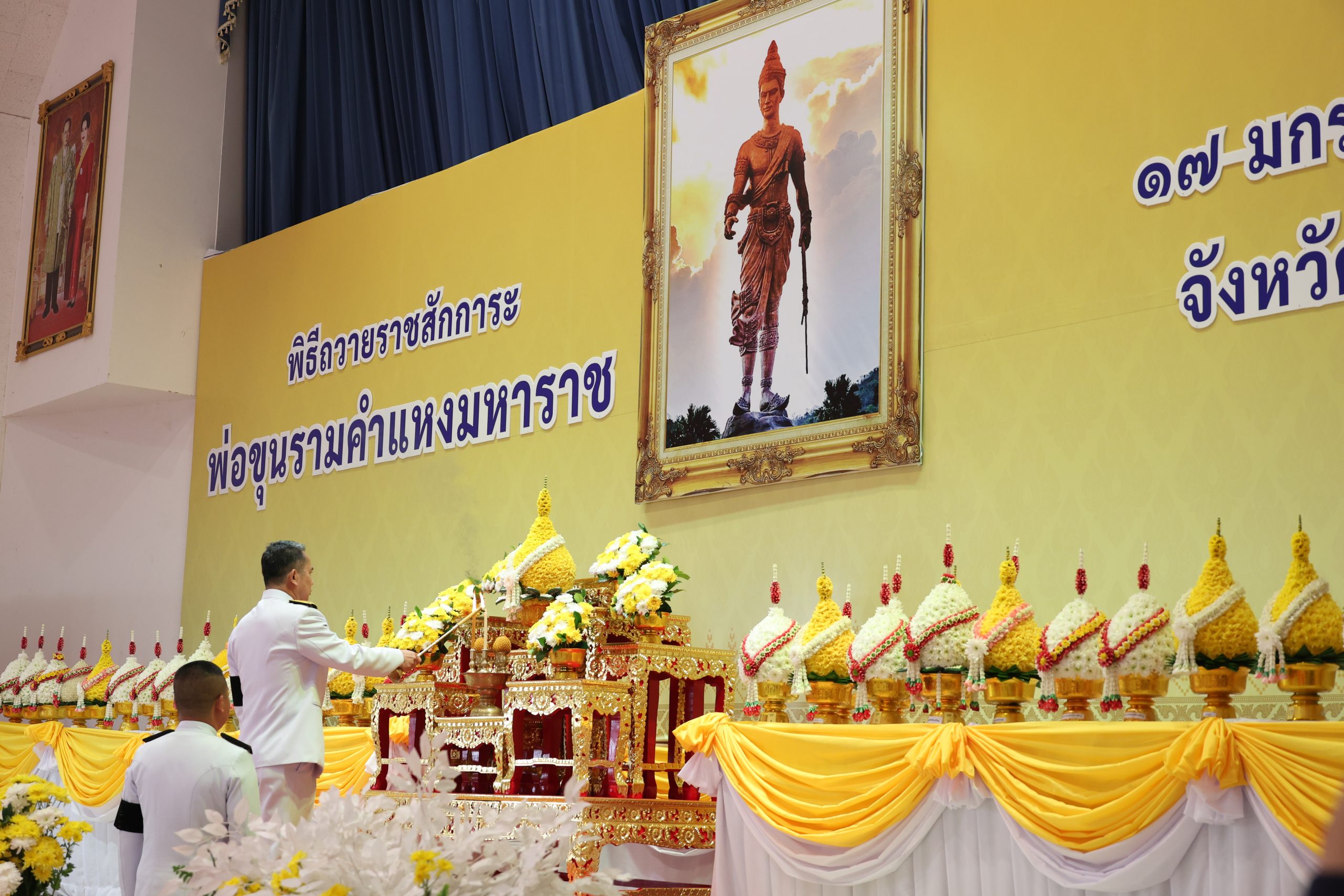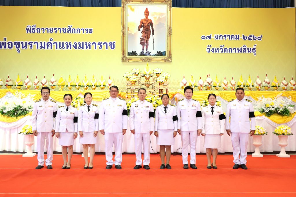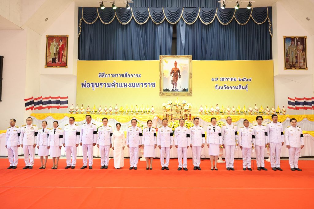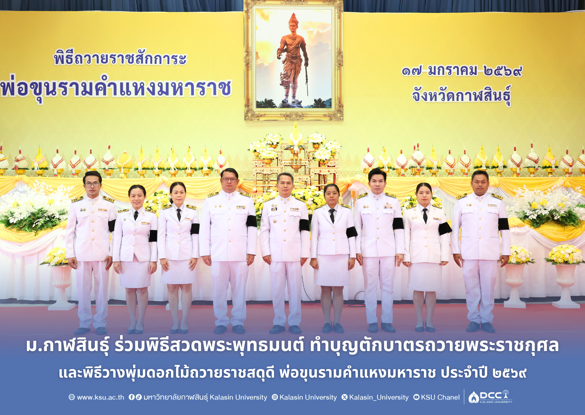 วันนี้(๑๗ ม.ค. ๒๕๖๙) เวลา ๐๗.๓๐ น. ที่หอประชุมจังหวัดกาฬสินธุ์ ศูนย์ราชการจังหวัดกาฬสินธุ์ อำเภอเมืองกาฬสินธุ์ จังหวัดกาฬสินธุ์ รองศาสตราจารย์ ดร.สุพรรณ สุดสนธิ์ อธิการบดีมหาวิทยาลัยกาฬสินธุ์ นำคณาจารย์ และบุคลากรมหาวิทยาลัยกาฬสินธุ์ ร่วมพิธีสวดพระพุทธมนต์ ทำบุญตักบาตรถวายพระราชกุศล และพิธีวางพุ่มดอกไม้ถวายราชสดุดี พ่อขุนรามคำแหงมหาราช ประจำปี ๒๕๖๙ นายสุวรรธณ์ เข็มธนเพ็ชร ผู้ว่าราชการจังหวัดกาฬสินธุ์ เป็นประธานในพิธี โดยมี นายผดุงศักดิ์ อิ่มเอิบ นางฐพัชร์รดา ธนินท์จิรานนท์ รองผู้ว่าราชการจังหวัดกาฬสินธุ์ ตุลาการ ทหาร ตำรวจ หัวหน้าส่วนราชการ ข้าราชการและพี่น้องประชาชน เข้าร่วมทำบุญตักบาตร ข้าวสาร อาหารแห้ง แด่พระภิกษุสงฆ์ เพื่อถวายเป็นพระราชกุศล จากนั้นผู้ว่าราชการจังหวัดกาฬสินธุ์ เป็นประธานในพิธีวางพานพุ่มดอกไม้ถวายราชสักการะและถวายราชสดุดีเนื่องในวันพ่อขุนรามคำแหงมหาราช ประจำปี ๒๕๖๙