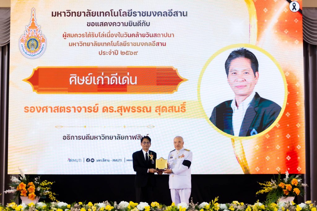 เมื่อวันที่ 16 มกราคม 2569 เวลา 09.00 น. ณ หอประชุมวทัญญู ณ ถลาง มหาวิทยาลัยเทคโนโลยีราชมงคลอีสาน (มทร.อีสาน) จังหวัดนครราชสีมา รองศาสตราจารย์ ดร.สุพรรณ สุดสนธิ์ อธิการบดีมหาวิทยาลัยกาฬสินธุ์ ได้เข้าร่วมพิธีเนื่องในวันคล้ายวันสถาปนามหาวิทยาลัยเทคโนโลยีราชมงคลอีสาน ประจำปี 2569ในโอกาสอันเป็นมงคลนี้ รองศาสตราจารย์ ดร.สุพรรณ สุดสนธิ์ ได้เข้ารับมอบ โล่ประกาศเกียรติคุณ “ศิษย์เก่าดีเด่น” เพื่อเชิดชูเกียรติในฐานะผู้ทำคุณประโยชน์และสร้างชื่อเสียงให้แก่สถาบัน ซึ่งบรรยากาศภายในงานเต็มไปด้วยความปลาบปลื้มยินดีจากคณะผู้บริหาร คณาจารย์ และศิษย์เก่าที่มาร่วมงานอย่างคับคั่งนอกจากนี้ ภายในงานยังได้รับเกียรติจาก มหาวิทยาลัยวงษ์ชวลิตกุล ที่เดินทางมาร่วมกิจกรรมและร่วมแสดงความยินดีใน พิธีรับพระบรมราชโองการโปรดเกล้าโปรดกระหม่อมแต่งตั้งอธิการบดีมหาวิทยาลัยเทคโนโลยีราชมงคลอีสาน ซึ่งถือเป็นวาระสำคัญยิ่งในการขับเคลื่อนสถาบันอุดมศึกษาให้ก้าวหน้าต่อไป สำหรับการจัดงานในครั้งนี้ มหาวิทยาลัยเทคโนโลยีราชมงคลอีสาน ได้จัด โครงการร่วมจิตน้อมเกล้าฯ สำนึกในพระมหากรุณาธิคุณ พระบาทสมเด็จพระบรมชนกาธิเบศร มหาภูมิพลอดุลยเดชมหาราช บรมนาถบพิตร เนื่องในวาระครบรอบ 21 ปี แห่งการสถาปนามหาวิทยาลัย เพื่อเป็นการรำลึกถึงพระมหากรุณาธิคุณและแสดงความจงรักภักดีต่อสถาบันพระมหากษัตริย์