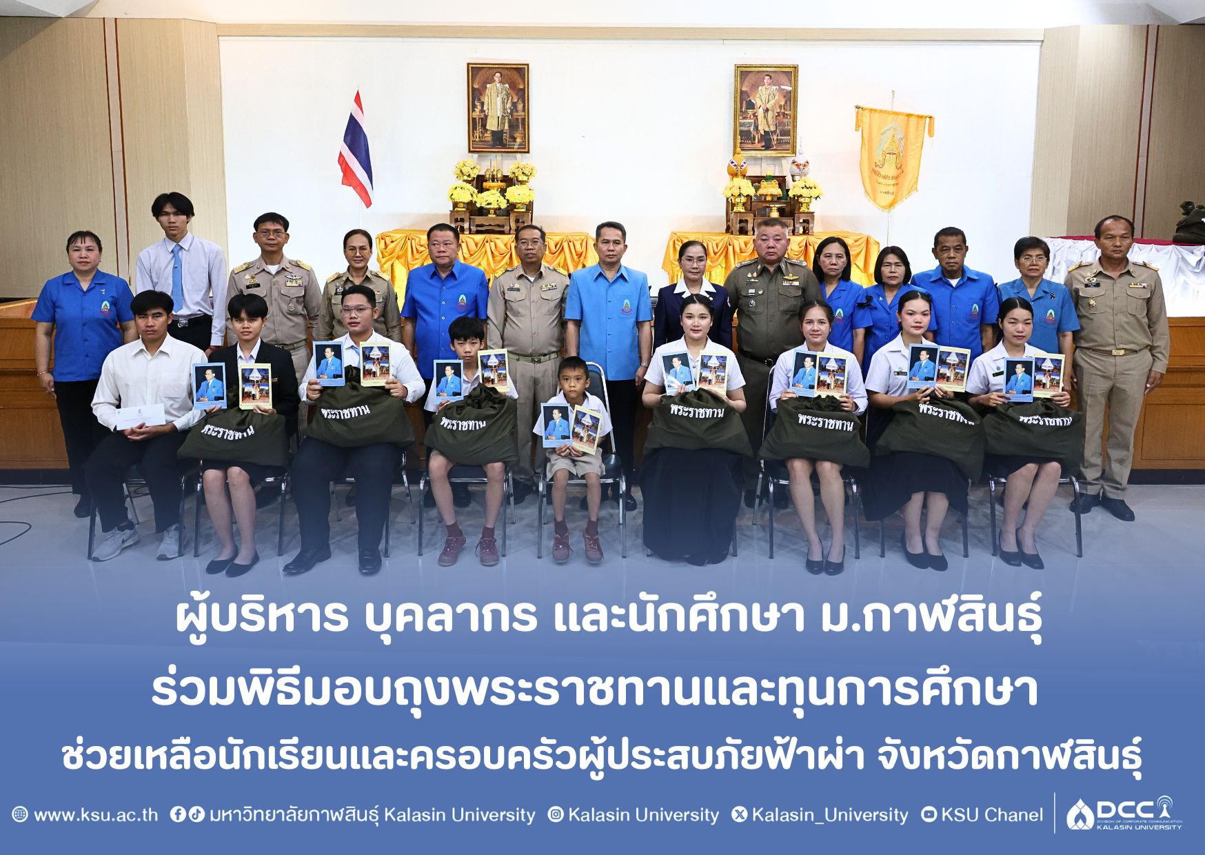 เมื่อวันที่ 26 มกราคม 2567 เวลา 08.30 น. ณ ห้องประชุม ชั้น 4 อาคารวิทยบริการและสารสนเทศ มหาวิทยาลัยกาฬสินธุ์ พื้นที่นามน จังหวัดกาฬสินธุ์ โดยผู้ช่วยศาสตราจารย์ ดร.คมสันทิ์ ขจรปัญญาไพศาล รองอธิการบดีมหาวิทยาลัยกาฬศินธุ์ พร้อมด้วยบุคลากร และนักศึกษา มหาวิทยาลัยกาฬสินธุ์ ซึ่งจัดขึ้นโดยสำนักงานพัฒนาสังคมและความมั่นคงของมนุษย์จังหวัดกาฬสินธุ์ ร่วมกับ มหาวิทยาลัยกาฬสินยธุ์ และหน่วยงานที่เกี่ยวข้อง จัดพิธีมอบถุงพระราชทานแก่นักเรียนทุนพระราชทานเพื่อการศึกษาสงเคราะห์ และมอบเงินช่วยเหลือครอบครัวผู้ประสบสาธารณภัยกรณีฟ้าผ่า