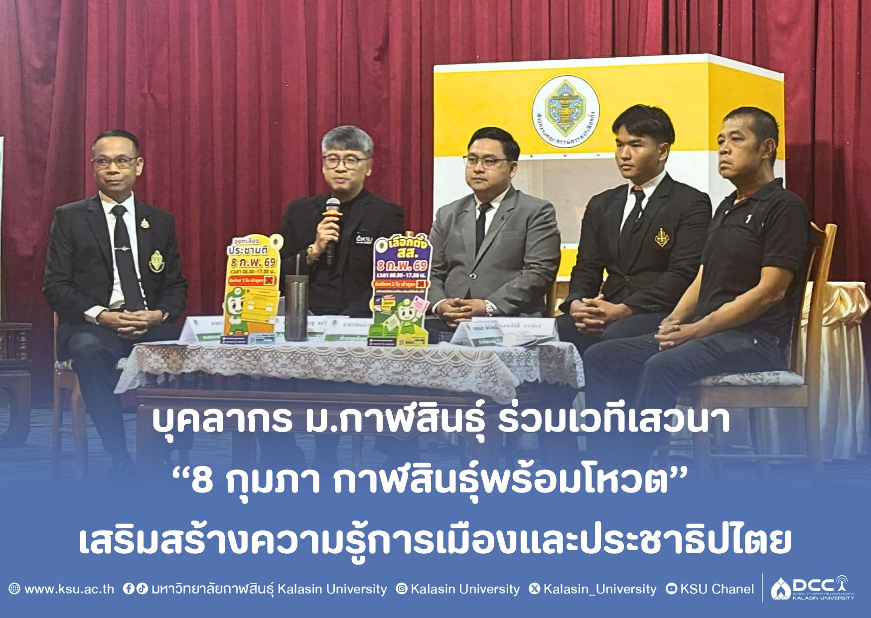 วันที่ 2 กุมภาพันธ์ 2569 คณาจารย์และนักศึกษา คณะศิลปศาสตร์ มหาวิทยาลัยกาฬสินธุ์ เข้าร่วมเวทีเสวนา “8 กุมภา กาฬสินธุ์พร้อมโหวต” ควบคู่กับกิจกรรม “สำนักงานคณะกรรมการการเลือกตั้งจังหวัดกาฬสินธุ์ พบสื่อมวลชนท้องถิ่น” ณ ห้องทศพร โรงแรมริมปาว อำเภอเมืองกาฬสินธุ์ จังหวัดกาฬสินธุ์