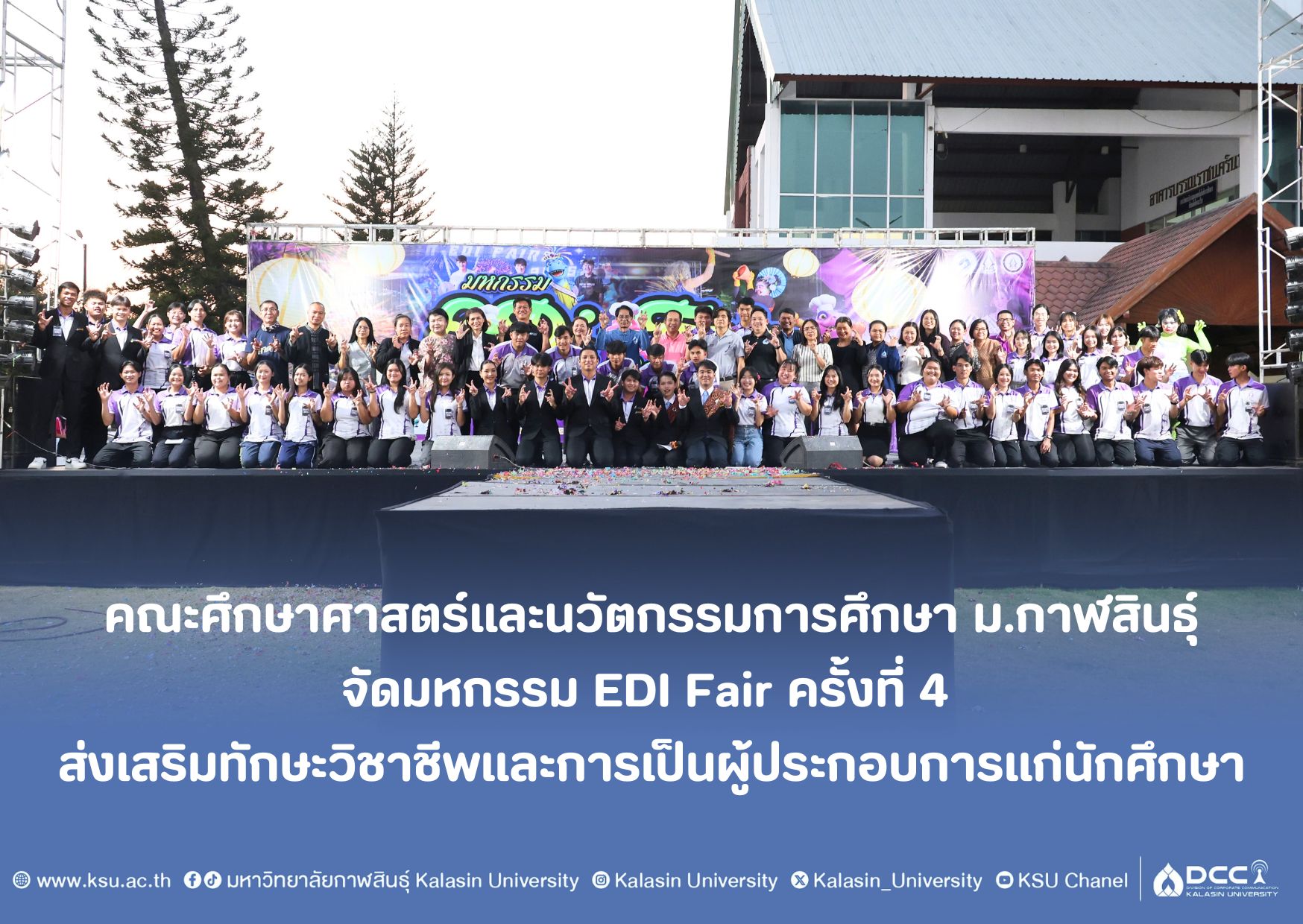 วันที่ 10 กุมภาพันธ์ 2569 เวลา 17.00 น. คณะศึกษาศาสตร์และนวัตกรรมการศึกษา มหาวิทยาลัยกาฬสินธุ์ พื้นที่นามน จัดพิธีเปิดโครงการ EDI Fair ครั้งที่ 4 โดยได้รับเกียรติจาก รองศาสตราจารย์ ดร.สุพรรณ สุดสนธิ์ อธิการบดีมหาวิทยาลัยกาฬสินธุ์ เป็นประธานในพิธีเปิดโครงการ