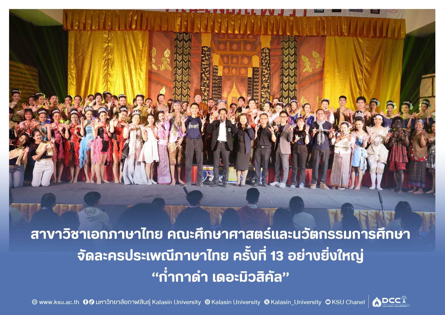 เมื่อวันที่ 12 กุมภาพันธ์ 2569 เวลา 19.00 น. ณ โรงละคร อาคารกิจการนักศึกษา (ช่อตะแบก) มหาวิทยาลัยกาฬสินธุ์ พื้นที่นามน สาขาวิชาเอกภาษาไทย คณะศึกษาศาสตร์และนวัตกรรมการศึกษา มหาวิทยาลัยกาฬสินธุ์ ได้จัดการแสดงละครประเพณีภาษาไทย ครั้งที่ 13 ในปีนี้ จัดขึ้นภายใต้ชื่อเรื่อง “ ก่ำกาดำ เดอะมิวสิคัล”