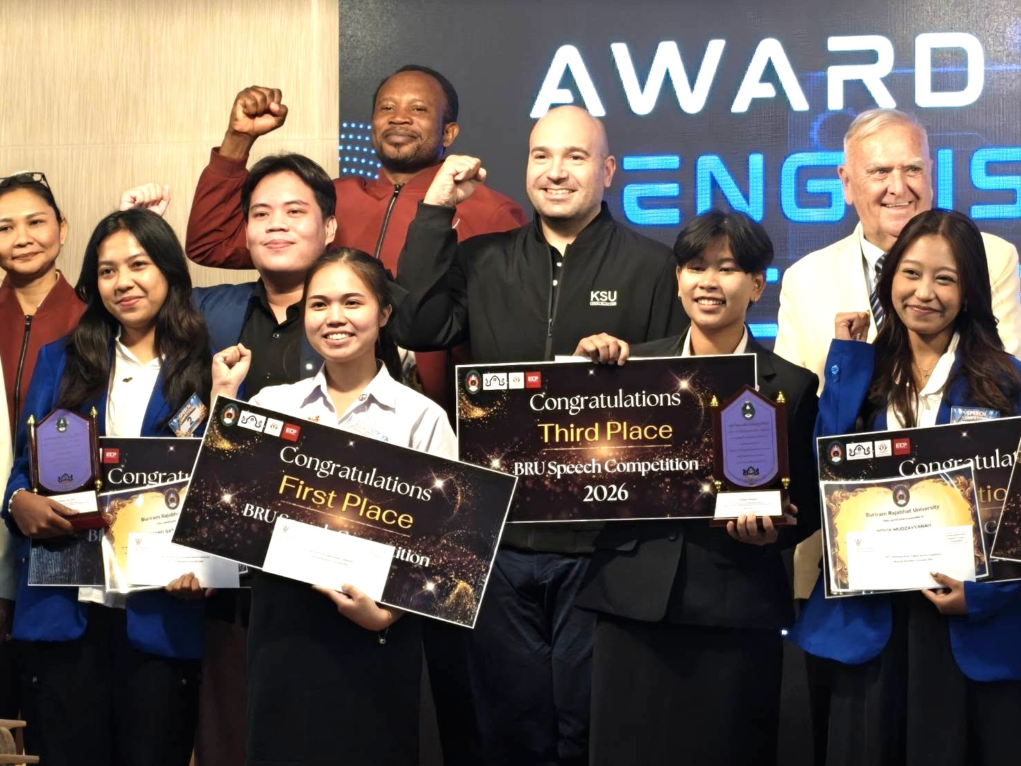เมื่อวันที่ 14 กุมภาพันธ์ 2569 ที่ผ่านมา ณ มหาวิทยาลัยราชภัฏบุรีรัมย์  นำโดยอาจารย์ Ahydroleen Naoy Suarez อาจารย์ ศุภควัฒ ทาทอง และอาจารย์ Jonathan Wary บรรยากาศเต็มไปด้วยความภาคภูมิใจ เมื่อ นางสาว Elisha Jicelle Terol นักศึกษาสาขา English for Business Communication มหาวิทยาลัยกาฬสินธุ์ สามารถคว้ารางวัลชนะเลิศการประกวดสุนทรพจน์ภาษาอังกฤษ BRICC2026 มาครองได้อย่างสง่างาม