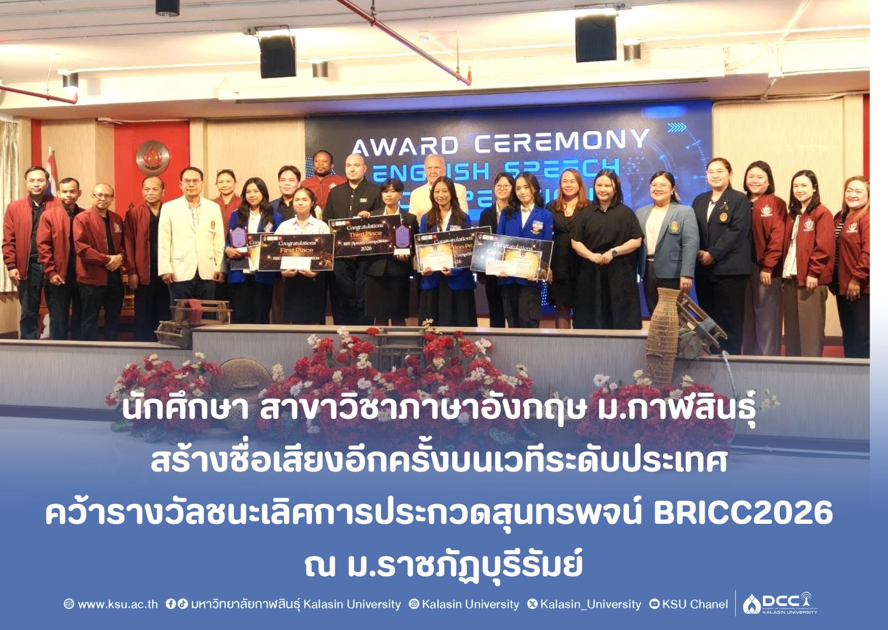 นักศึกษา สาขาวิชาภาษาอังกฤษ ม.กาฬสินธุ์ สร้างชื่อเสียงอีกครั้งบนเวทีระดับประเทศ คว้ารางวัลชนะเลิศการประกวดสุนทรพจน์ BRICC2026 ณ มหาวิทยาลัยราชภัฏบุรีรัมย์