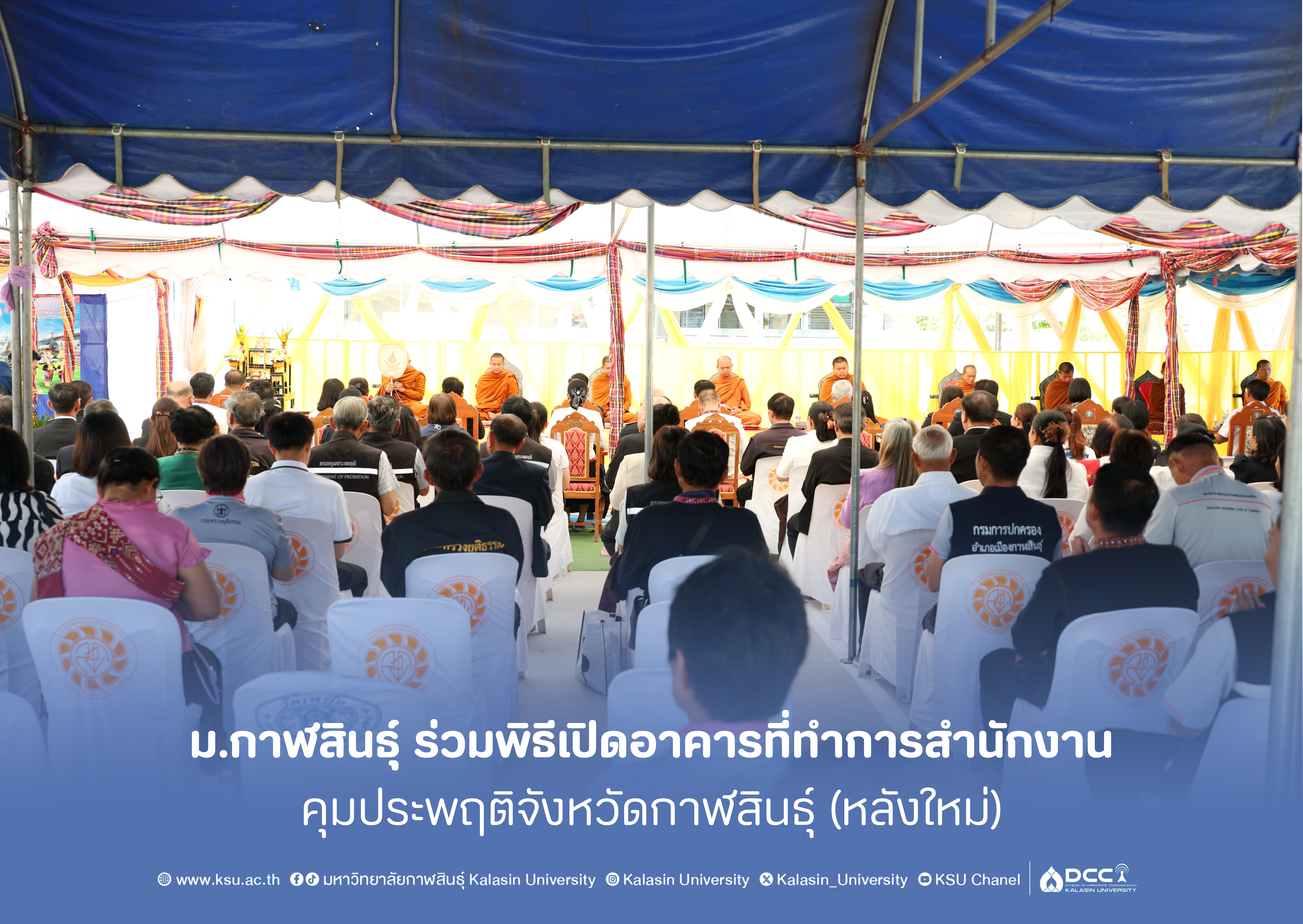 วันนี้ (19 กุมภาพันธ์ 2569) เวลา 09.30 น. นายวิจิตร ศิริกิจ ผู้ช่วยอธิการบดีมหาวิทยาลัยกาฬสินธุ์ พร้อมด้วยบุคลากร เข้าร่วมพิธีเปิดอาคารที่ทำการสำนักงานคุมประพฤติจังหวัดกาฬสินธุ์ (หลังใหม่) ณ อำเภอเมืองกาฬสินธุ์ จังหวัดกาฬสินธุ์ โดยมี พระญาณรักขิต เจ้าคณะจังหวัดกาฬสินธุ์ (ธ) เจ้าอาวาสวัดโสภณพัฒนาราม เป็นประธานฝ่ายสงฆ์ และนายผดุงศักดิ์ อิ่มเอิบ รองผู้ว่าราชการจังหวัดกาฬสินธุ์ เป็นประธานฝ่ายฆราวาส เพื่อความเป็นสิริมงคลและรองรับการขยายงานบริการประชาชนในด้านกระบวนการยุติธรรมของจังหวัดให้มีประสิทธิภาพยิ่งขึ้น ในการนี้ มีผู้บริหารระดับสูงและหัวหน้าส่วนราชการเข้าร่วมเป็นเกียรติอย่างคับคั่ง อาทิ นางนุสรา วงษ์สุวรรณ รองอธิบดีกรมคุมประพฤติ ผู้พิพากษาหัวหน้าศาลจังหวัดกาฬสินธุ์ ผู้พิพากษาหัวหน้าศาลเยาวชนและครอบครัวจังหวัดกาฬสินธุ์ อัยการจังหวัดกาฬสินธุ์ ผู้อำนวยการสำนักงานคุมประพฤติ เขต 4 พร้อมด้วยข้าราชการและบุคลากรสังกัดกระทรวงยุติธรรม ซึ่งการเข้าร่วมพิธีของมหาวิทยาลัยกาฬสินธุ์ในครั้งนี้ ถือเป็นการกระชับความสัมพันธ์และประสานความร่วมมือระหว่างสถาบันการศึกษากับหน่วยงานภาครัฐ เพื่อขับเคลื่อนการพัฒนาท้องถิ่นและสนับสนุนภารกิจด้านสังคมร่วมกันอย่างยั่งยืน