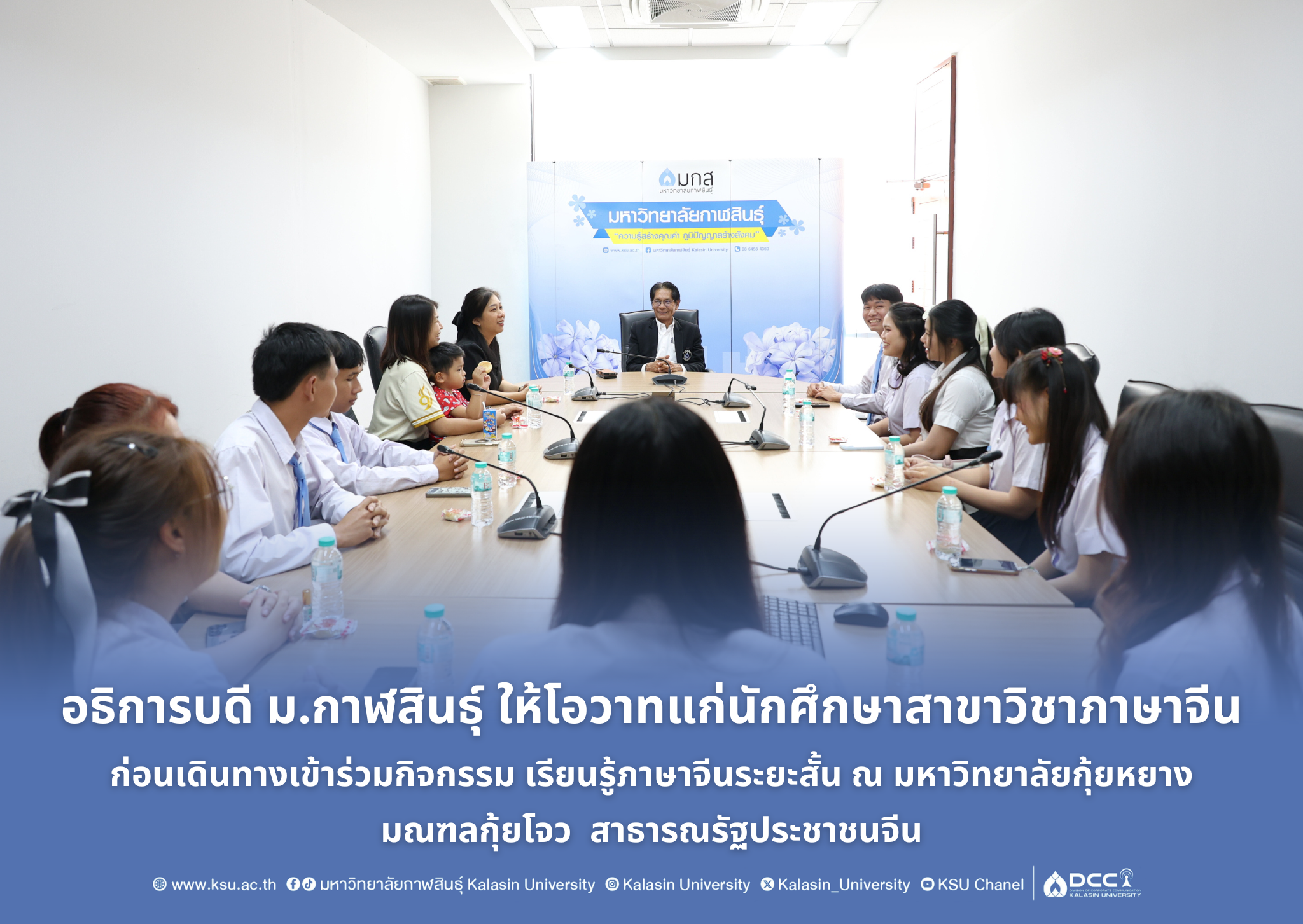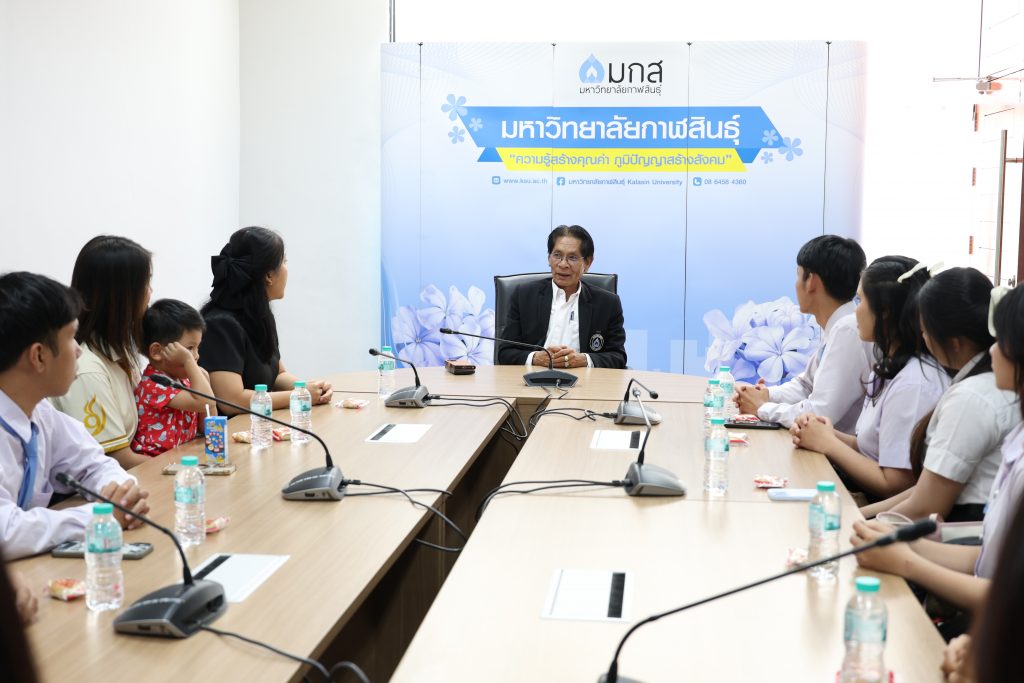 วันที่ 20 กุมภาพันธ์ 2569 ณ ห้องประชุม 603 อาคารเฉลิมพระเกียรติกรมสมเด็จพระเทพรัตนราชสุดา ฯ ๗๐ พรรษา มหาวิทยาลัยกาฬสินธุ์ พื้นที่ในเมือง สาขาวิชาภาษาจีนคณะศิลปศาสตร์นำนักศึกษาชั้นปีที่ 2 จำนวน 11 คนเข้าพบอธิการบดีเพื่อขอพรก่อนเดินทางเข้าร่วมกิจกรรม เรียนรู้ภาษาจีนระยะสั้น ณ มหาวิทยาลัยกุ้ยหยาง มณฑลกุ้ยโจว สาธารณรัฐประชาชนจีน ระยะเวลาโครงการ ระหว่างวันที่ 1 มีนาคมถึงวันที่ 30 มิถุนายนพ. ศ. 2569 ตามข้อตกลงความร่วมมือทางวิชาการระหว่างมหาวิทยาลัยกุ้ยหยางและมหาวิทยาลัยกาฬสินธุ์