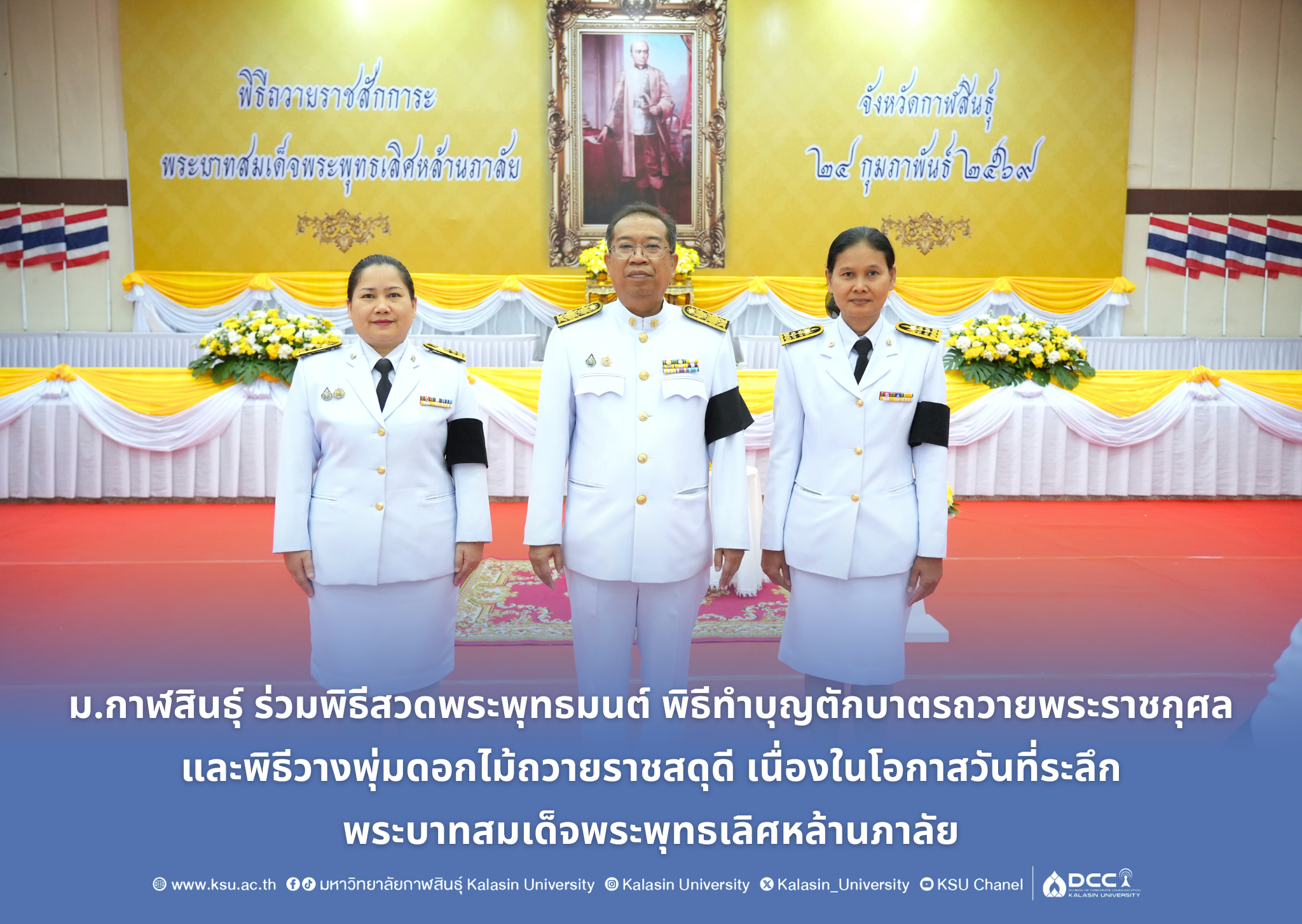 วันนี้ (24 ก.พ. 2569) เวลา 07.30 น. ณ หอประชุมเฉลิมพระเกียรติ 80 พรรษามหาราชา อำเภอเมืองกาฬสินธุ์ จังหวัดกาฬสินธุ์ ผู้ช่วยศาสตราจารย์ ดร.คมสันทิ์ ขจรปัญญาไพศาล รองอธิการบดีมหาวิทยาลัยกาฬสินธุ์ พร้อมด้วยบุคลากรมหาวิทยาลัยกาฬสินธุ์ ร่วมพิธีเจริญพระพุทธมนต์ พิธีทำบุญตักบาตรถวายพระราชกุศล และพิธีวางพุ่มดอกไม้ถวายราชสดุดี เนื่องในโอกาสวันที่ระลึกพระบาทสมเด็จพระพุทธเลิศหล้านภาลัย นายสุวรรธณ์ เข็มธนเพ็ชร ผู้ว่าราชการจังหวัดกาฬสินธุ์ เป็นประธานในพิธีฯ โดยมี ข้าราชการ ศาล ทหาร ตำรวจ และประชาชนชาวจังหวัดกาฬสินธุ์ เพื่อถวายเป็นพระราชกุศลแด่พระบาทสมเด็จพระพุทธเลิศหล้านภาลัย เพื่อแสดงความสำนึกในพระมหากรุณาธิคุณ ที่ทรงปฏิบัติพระราชกรณียกิจสำคัญที่มีต่อการสร้างสรรค์ชาติไทย ทั้งด้านการเมืองการปกครอง สังคมวัฒนธรรม และด้านศิลปกรรมและวรรณกรรมที่ทรงพระราชนิพนธ์วรรณกรรมมากมาย
