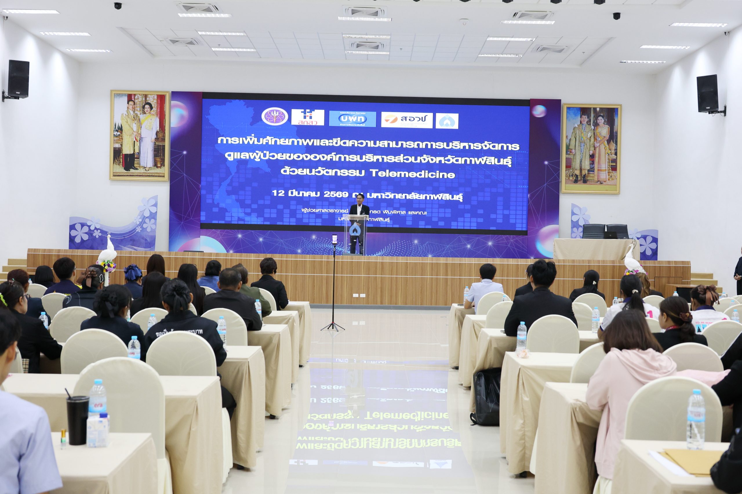 วันนี้ (12 มีนาคม 2569) เวลา 09.30 น. ณ ห้องประชุมพยับหมอก ชั้น 3 อาคารเฉลิมพระเกียรติกรมสมเด็จพระเทพรัตนราชสุดาฯ 70 พรรษา มหาวิทยาลัยกาฬสินธุ์ พื้นที่ในเมือง รองศาสตราจารย์ ดร.สุพรรณ สุดสนธิ์ อธิการบดีมหาวิทยาลัยกาฬสินธุ์ เป็นประธานเปิดการอบรมเชิงปฏิบัติการ “การถอดบทเรียน การเพิ่มศักยภาพและขีดความสามารถการบริหารจัดการดูแลผู้ป่วยขององค์การบริหารส่วนจังหวัดกาฬสินธุ์ ด้วยนวัตกรรม Telemedicine” และ ดร.ศิรินันท์ หล่อตระกูล รองนายกองค์การบริหารส่วนจังหวัด ร่วมพูดปะพูดคุยประเด็นยกระดับระบบสาธารณสุขท้องถิ่น จัดอบรมถอดบทเรียนนวัตกรรม “Telemedicine” จัดโดยคณะนักวิจัย นำโดย ผู้ช่วยศาสตราจารย์ ดร.ทรงกรด พิมพิศาล การจัดกิจกรรมในวันนี้จัดขึ้นภายใต้โครงการวิจัยการเพิ่มศักยภาพและขีดความสามารถการบริหารจัดการดูแลผู้ป่วยขององค์การบริหารส่วนจังหวัดกาฬสินธุ์ ด้วยนวัตกรรม Telemedicine ซึ่งดำเนินการโดยมหาวิทยาลัยกาฬสินธุ์ ร่วมกับองค์การบริหารส่วนจังหวัดกาฬสินธุ์ หน่วยงานสาธารณสุขในพื้นที่ โรงพยาบาลชุมชน โรงพยาบาลส่งเสริมสุขภาพตำบล ตลอดจนภาคีเครือข่ายและชุมชนในพื้นที่ โครงการวิจัยนี้ได้รับงบประมาณสนับสนุนจาก หน่วยบริหารและจัดการทุนด้านการพัฒนาระดับพื้นที่ (บพท.) มุ่งเน้นการบูรณาการความร่วมมือระหว่างมหาวิทยาลัย องค์การบริหารส่วนจังหวัดกาฬสินธุ์ โรงพยาบาลชุมชน และ รพ.สต. เพื่อประยุกต์ใช้เทคโนโลยีการแพทย์ทางไกล (Telemedicine) ในการเพิ่มโอกาสการเข้าถึงบริการทางการแพทย์ ลดความเหลื่อมล้ำ และสนับสนุนให้บุคลากรในพื้นที่สามารถติดตามดูแลผู้ป่วยได้อย่างต่อเนื่องและมีประสิทธิภาพมากยิ่งขึ้น โดยเฉพาะในพื้นที่ห่างไกล