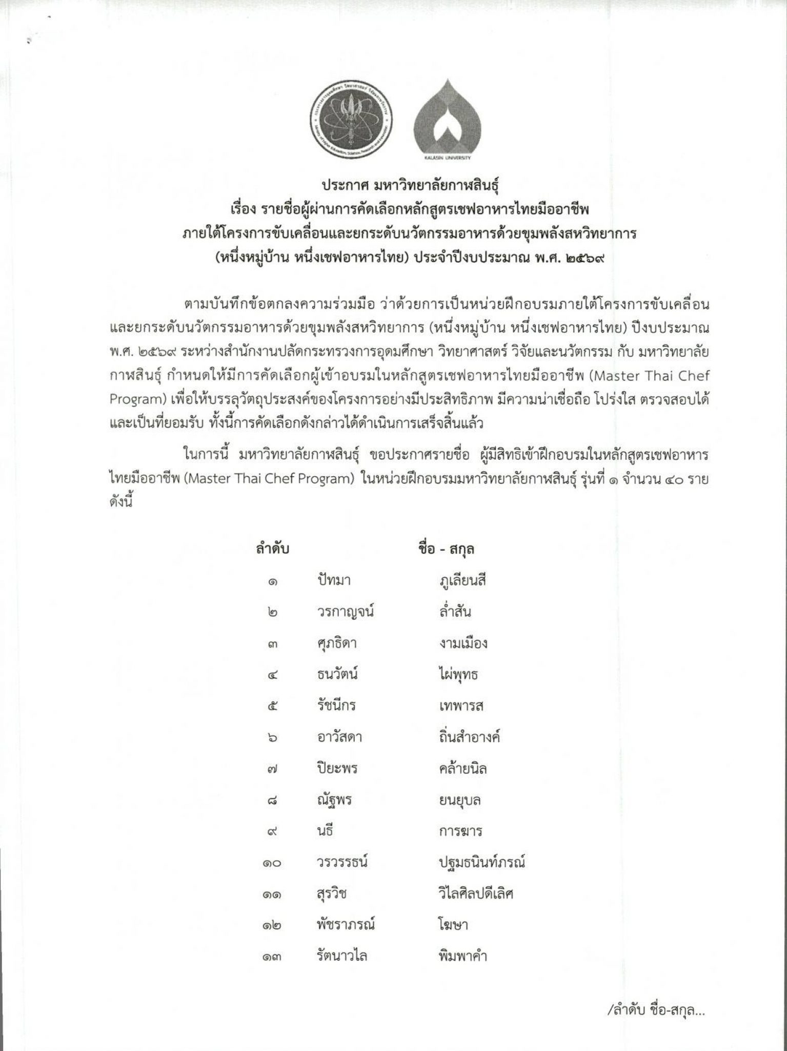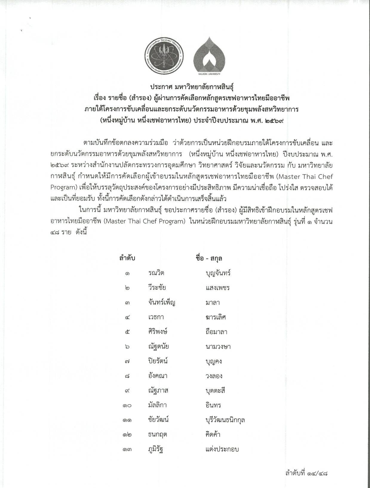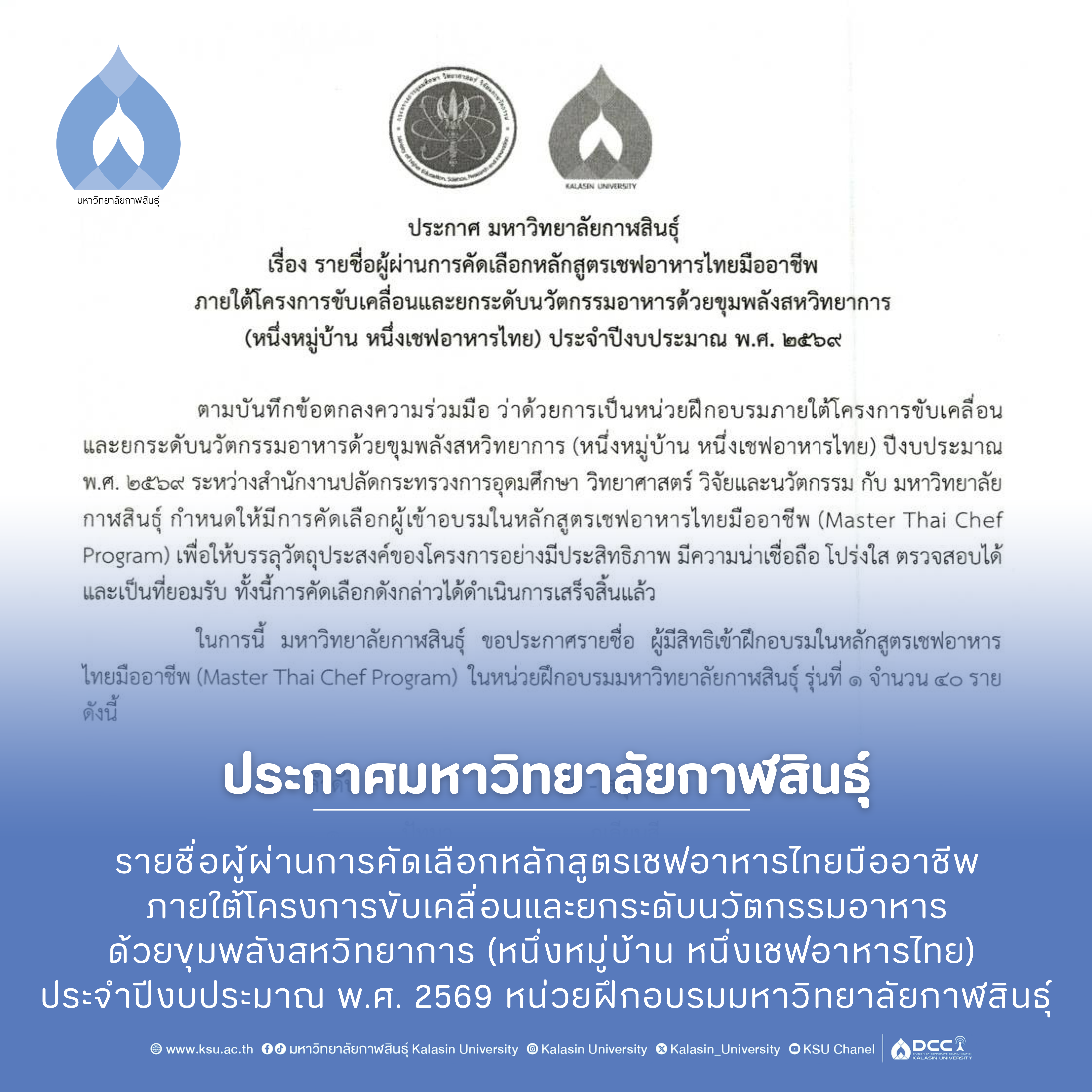 รายชื่อผู้ผ่านการคัดเลือกหลักสูตรเชฟอาหารไทยมืออาชีพ ภายใต้โครงการขับเคลื่อนและยกระดับนวัตกรรมอาหาร ด้วยขุมพลังสหวิทยาการ (หนึ่งหมู่บ้าน หนึ่งเชฟอาหารไทย) ประจำปีงบประมาณ พ.ศ. 2569 หน่วยฝึกอบรมมหาวิทยาลัยกาฬสินธุ์