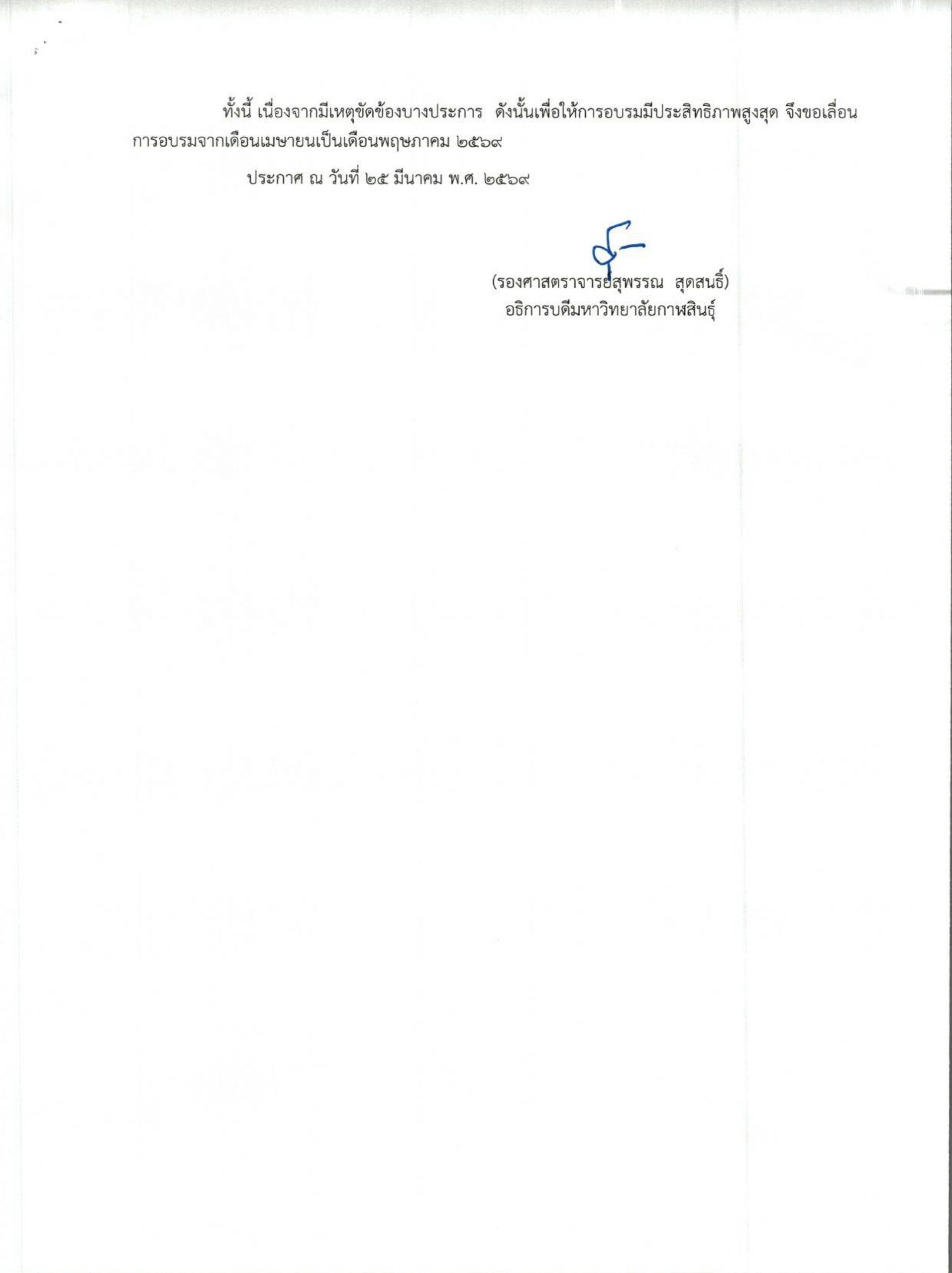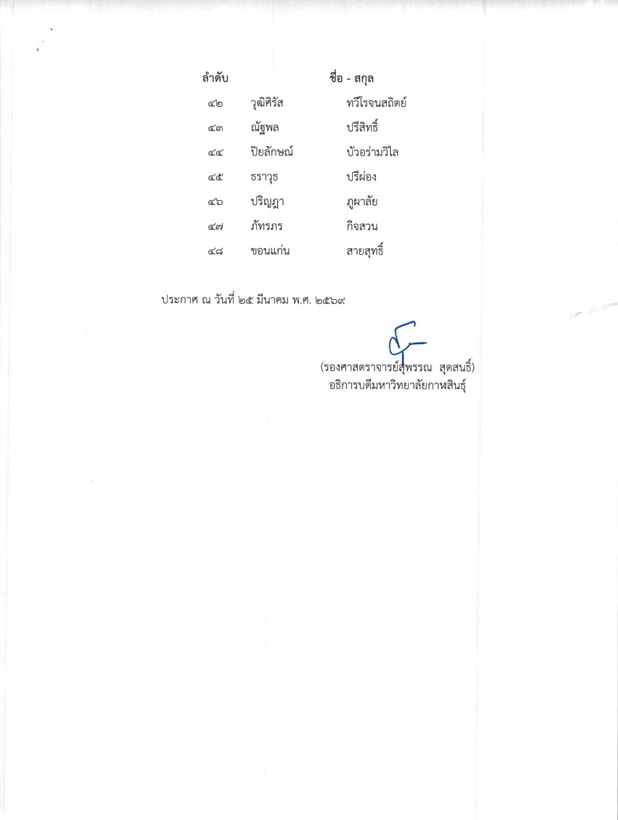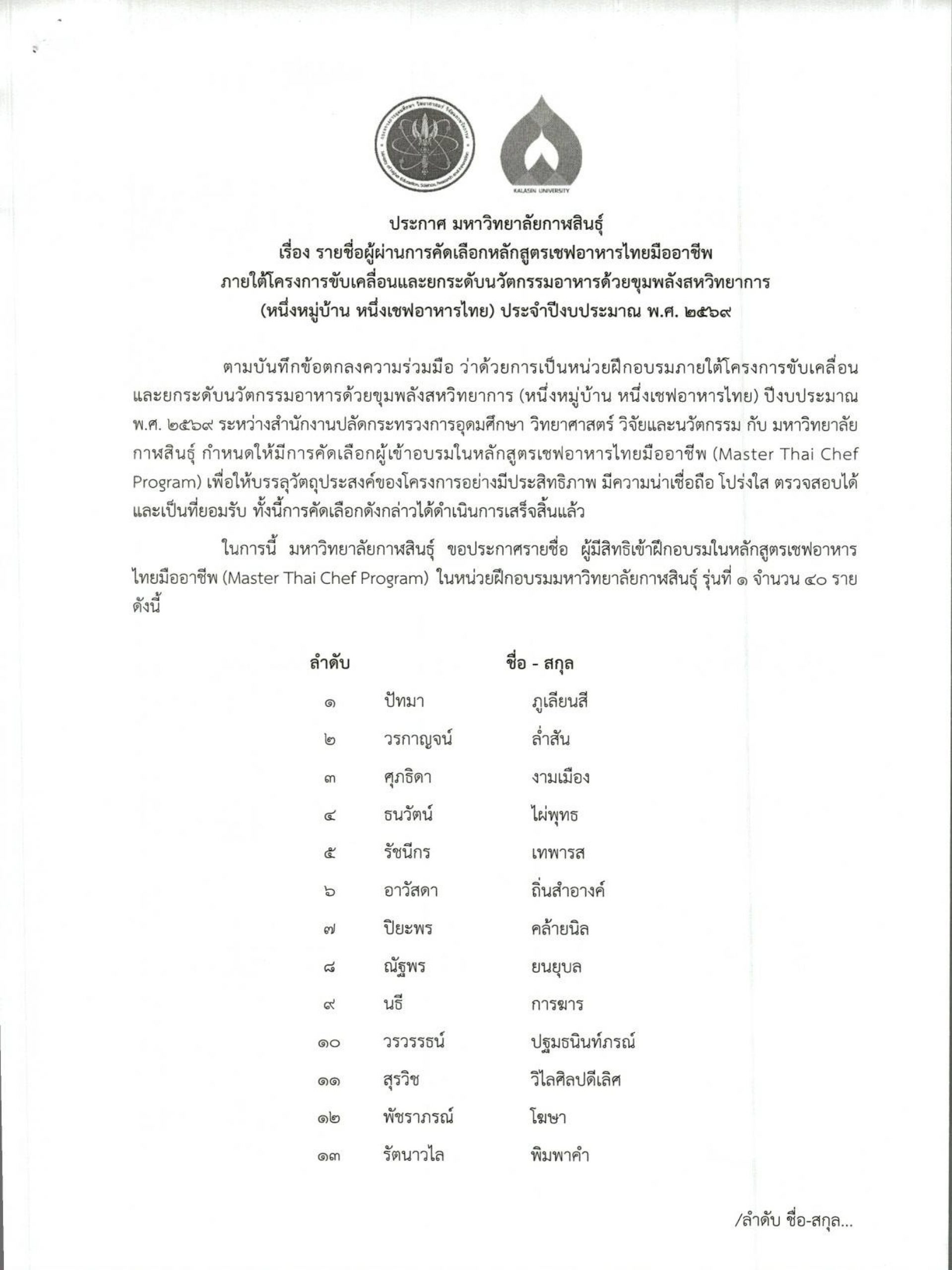 รายชื่อผู้ผ่านการคัดเลือกหลักสูตรเชฟอาหารไทยมืออาชีพ ภายใต้โครงการขับเคลื่อนและยกระดับนวัตกรรมอาหาร ด้วยขุมพลังสหวิทยาการ (หนึ่งหมู่บ้าน หนึ่งเชฟอาหารไทย) ประจำปีงบประมาณ พ.ศ. 2569 หน่วยฝึกอบรมมหาวิทยาลัยกาฬสินธุ์